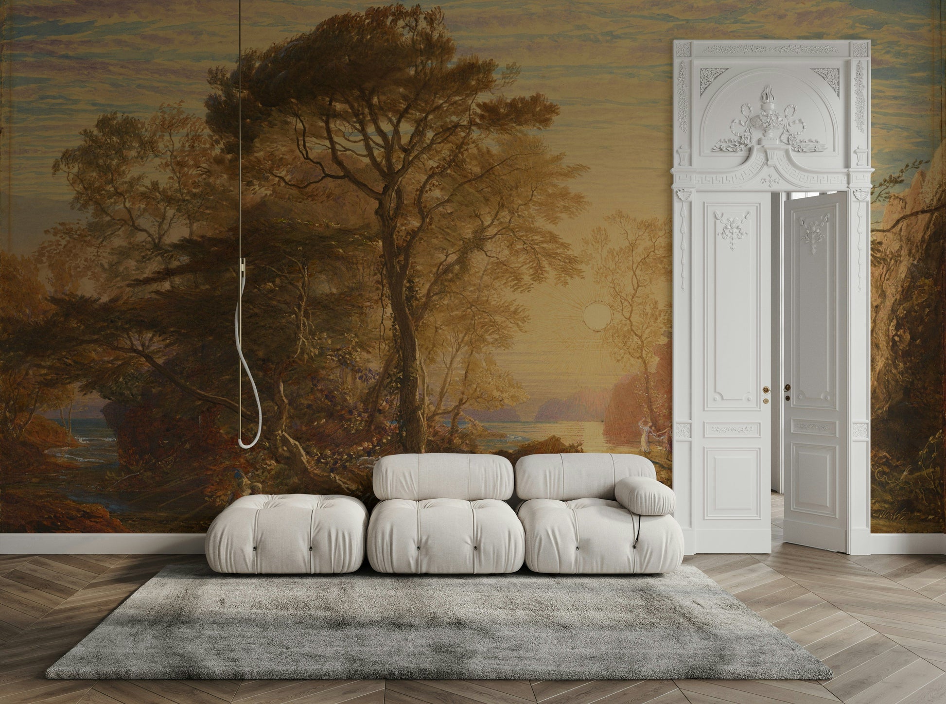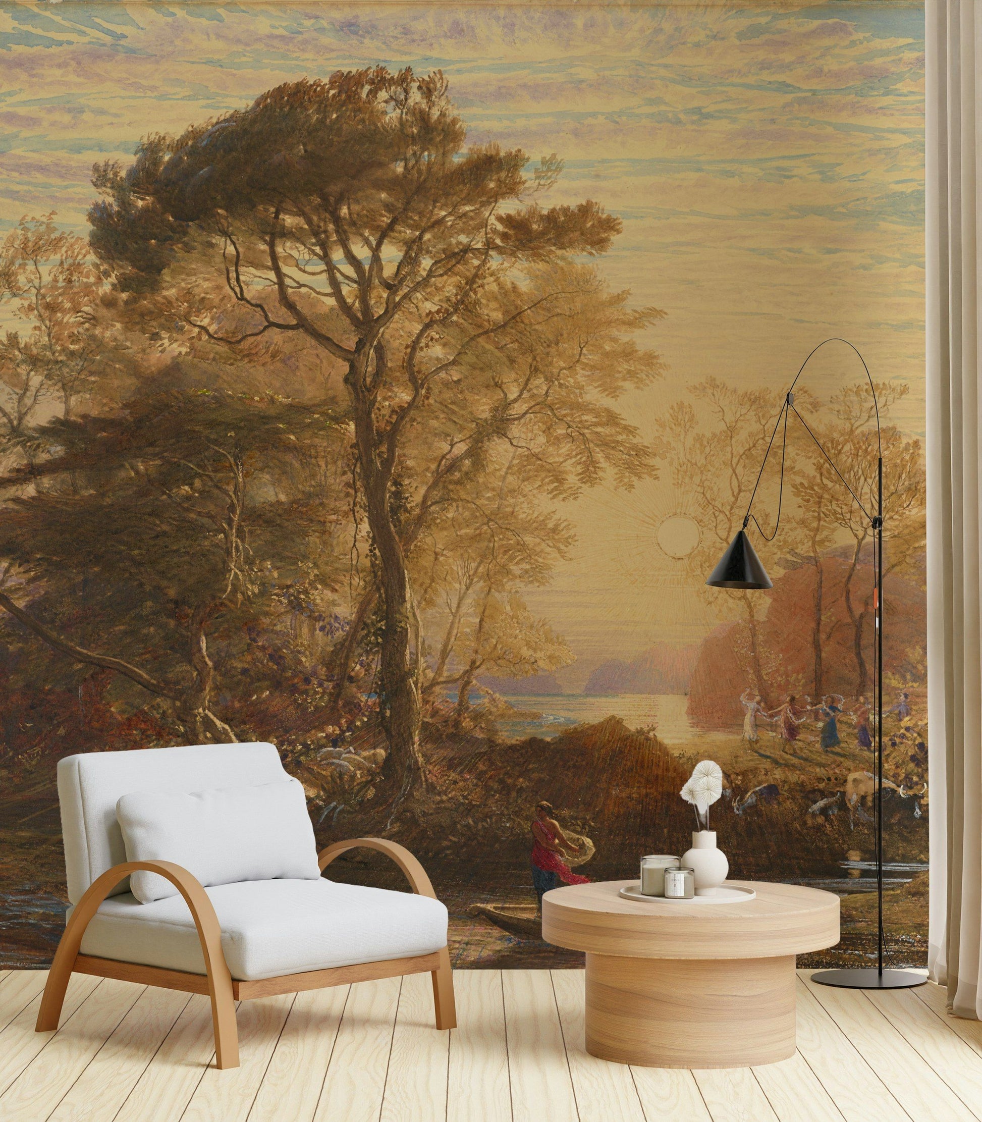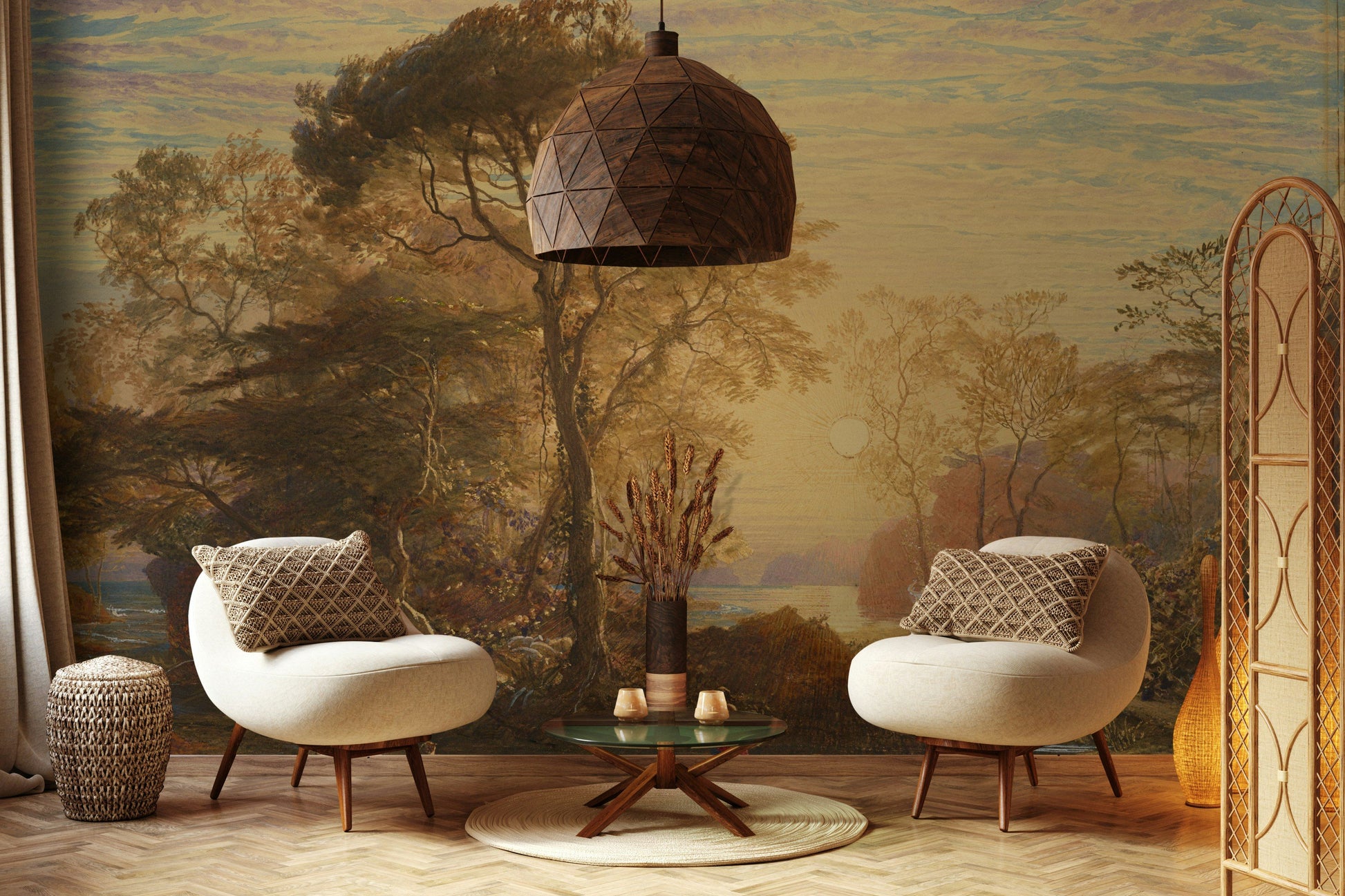 Bring the beauty of nature and artistry into your home with this stunning vibrant landscape wallpaper. Featuring a picturesque sunset scene with detailed trees, people, and a boat on the water, this wallpaper captures the essence of a serene and lively outdoor setting. The rich colors and intricate hand-painted style create a warm and inviting atmosphere, perfect for any room. Ideal for living rooms, bedrooms, or any space that seeks to incorporate a touch of natural beauty and artistic elegance. This wallpaper is perfect for creating a feature wall that stands out with its captivating and timeless aesthetic..