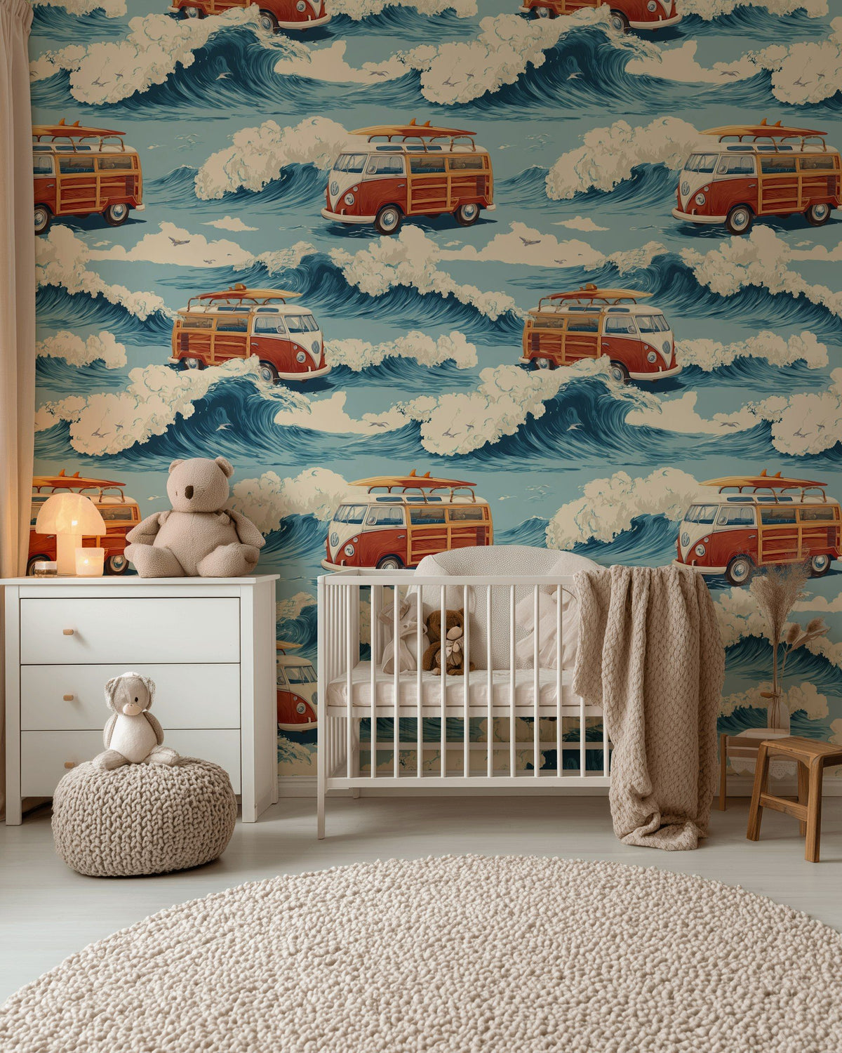 Classic surf vans ride vibrant ocean waves against a lively blue backdrop, evoking a vintage coastal adventure. The striking pattern and bold colors create a playful focal point, perfect for inspiring exploration in a children's playroom or teen retreat. Light enhances the detailed waves, adding motion and energy to the space. Complements bohemian and coastal decor, coordinating well with beachy accents and rattan furniture.
