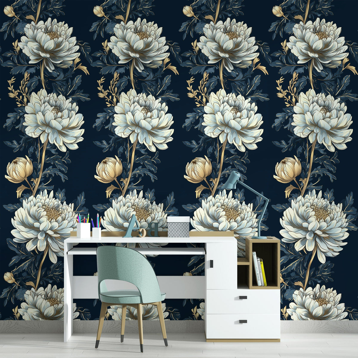The wallpaper's grandiose floral patterns in soft cream tones on a deep navy background add a touch of opulence and sophistication, perfect for luxury decor. Pair it with velvet furnishings and metallic accents to enhance its dramatic effect.