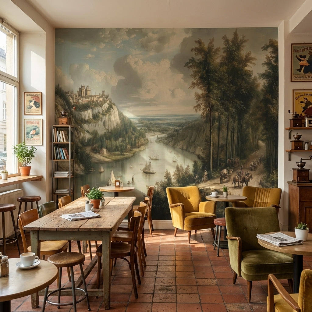 This wallpaper includes a serene landscape with sailboats on a river, surrounded by lush trees and distant mountains. The classic style and earthy tones of green, blue, and beige make it suitable for traditional decor.