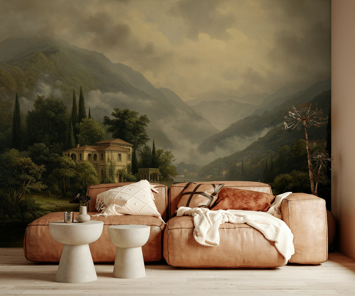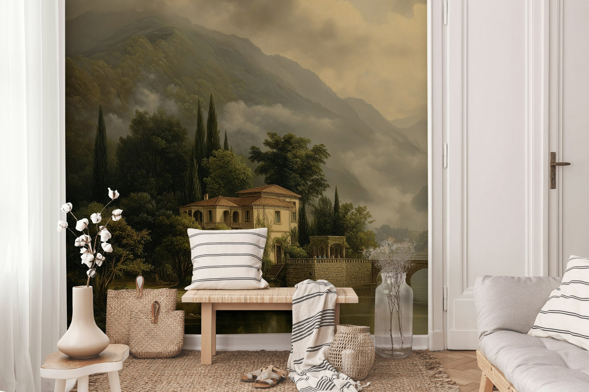 This mural includes a quaint villa with a bridge over a tranquil river, surrounded by lush green forests and majestic mountains. The classic design and soothing colors create a serene atmosphere perfect for traditional decor.
