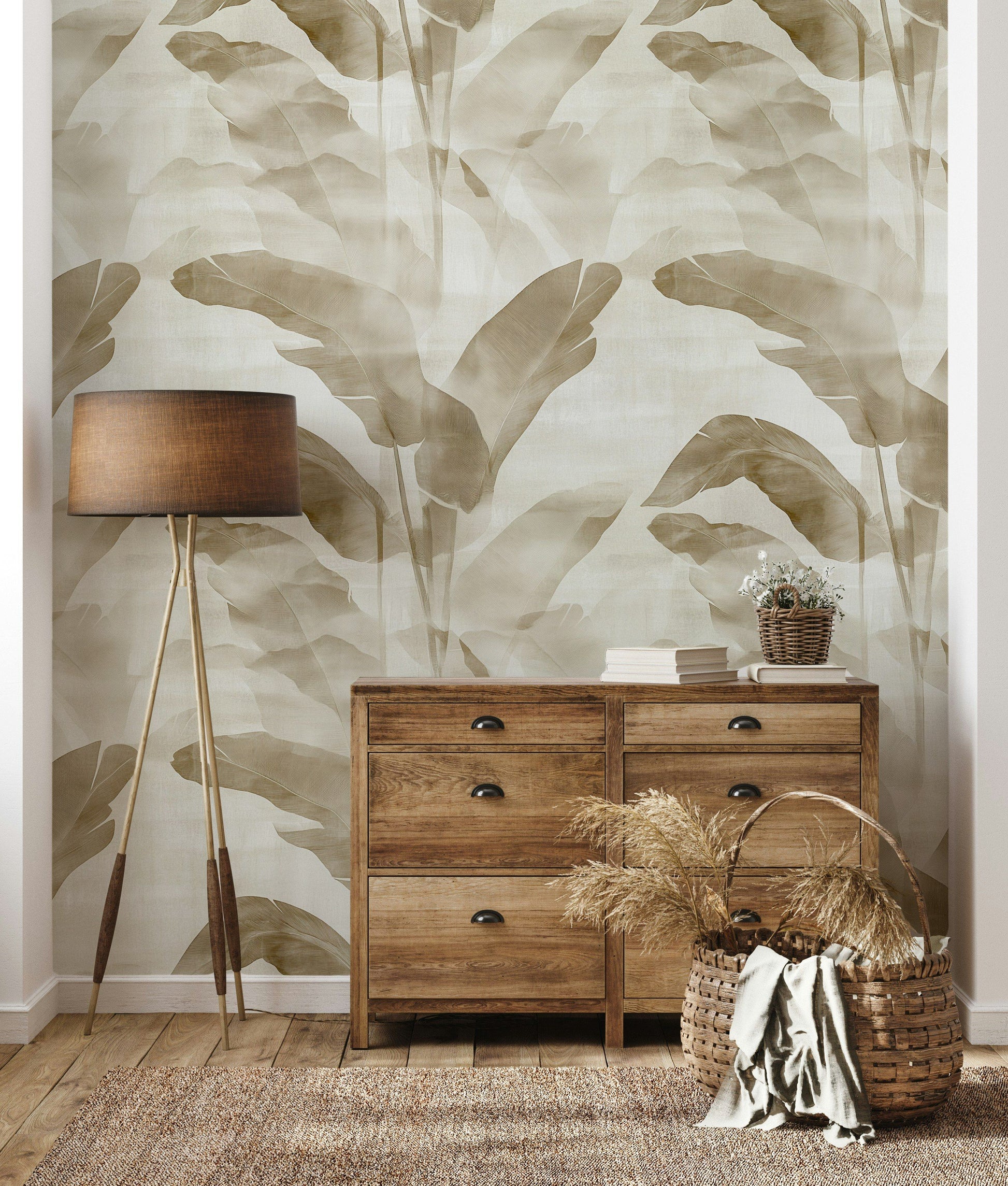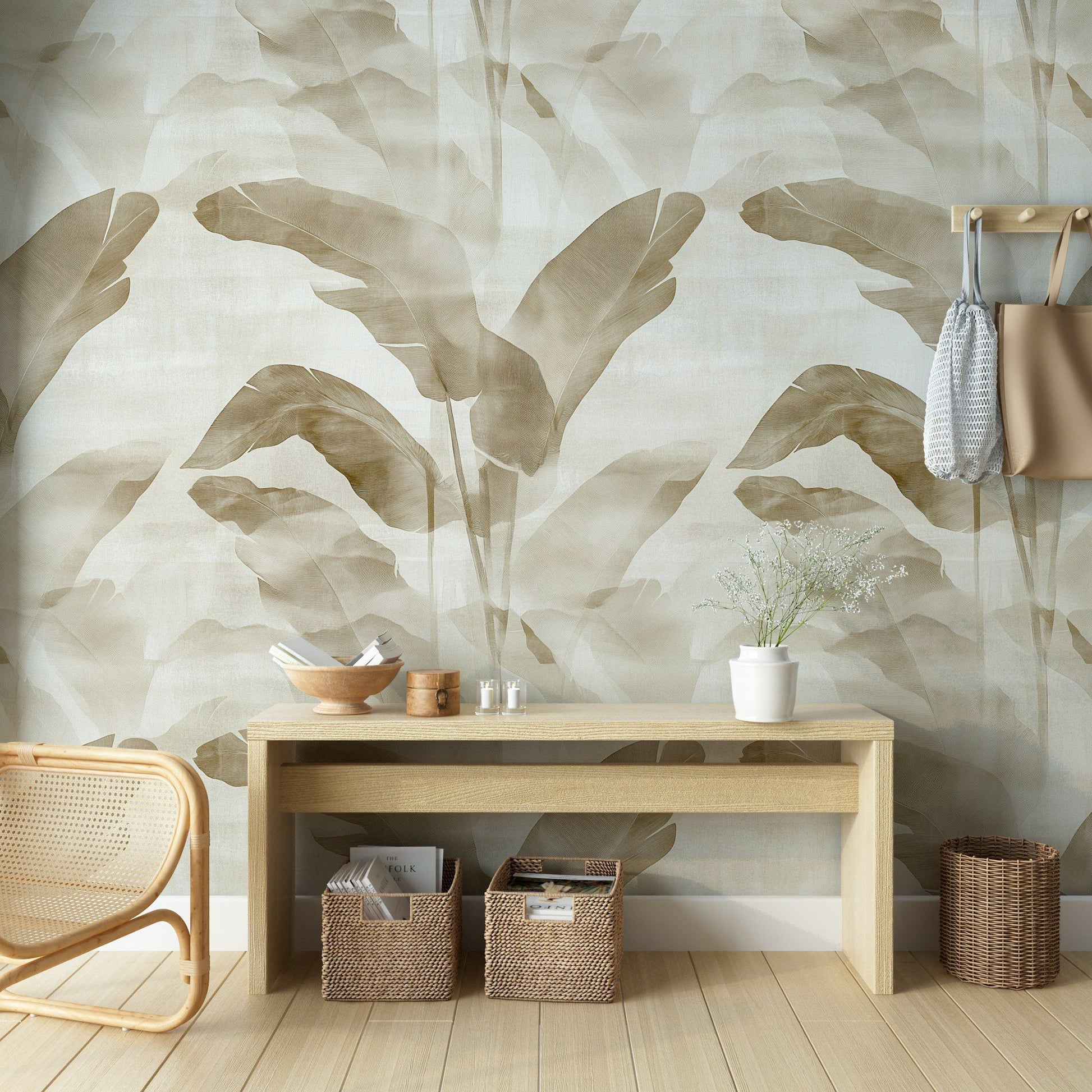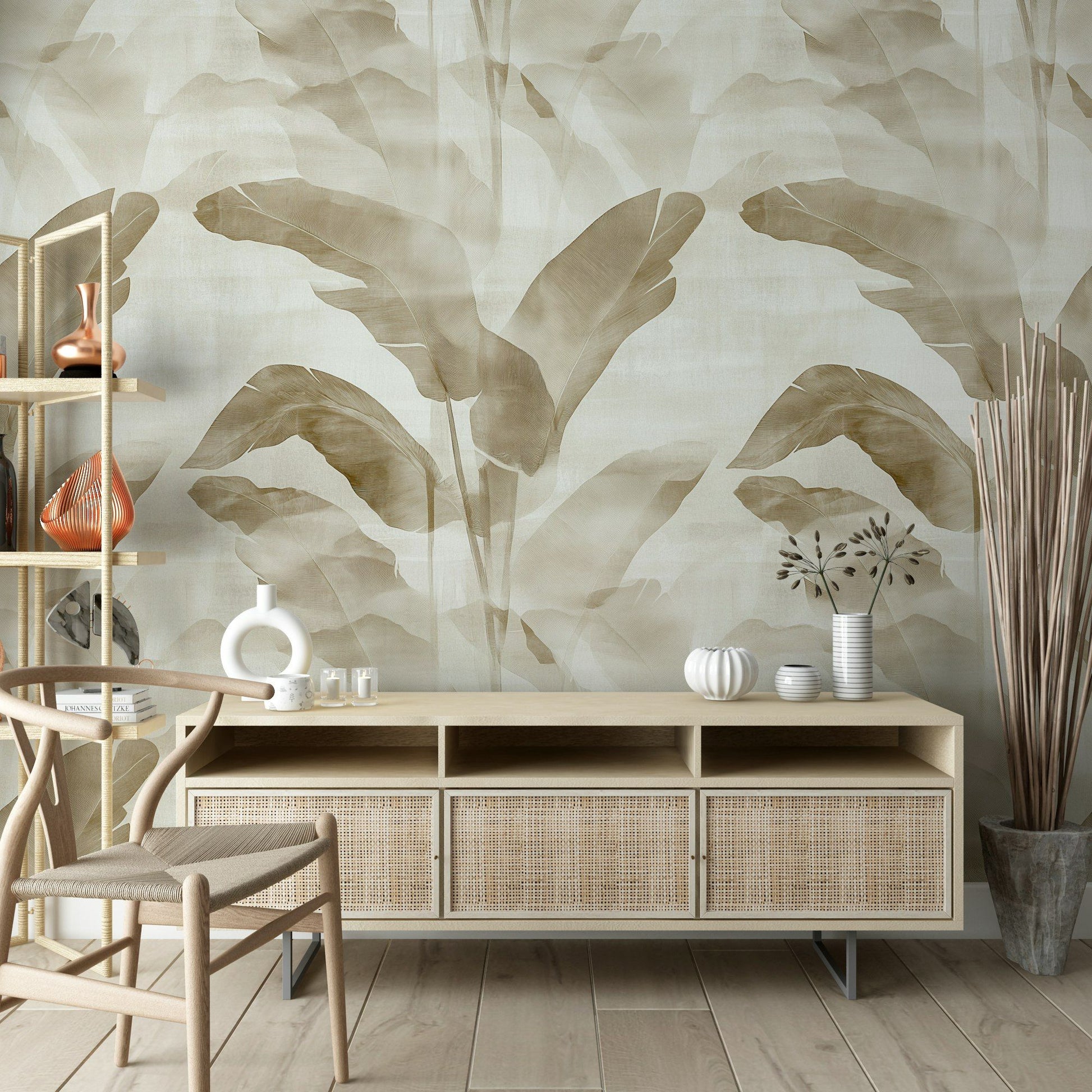 Tropical Banana Leaf Wallpaper Beige and White Wall Mural