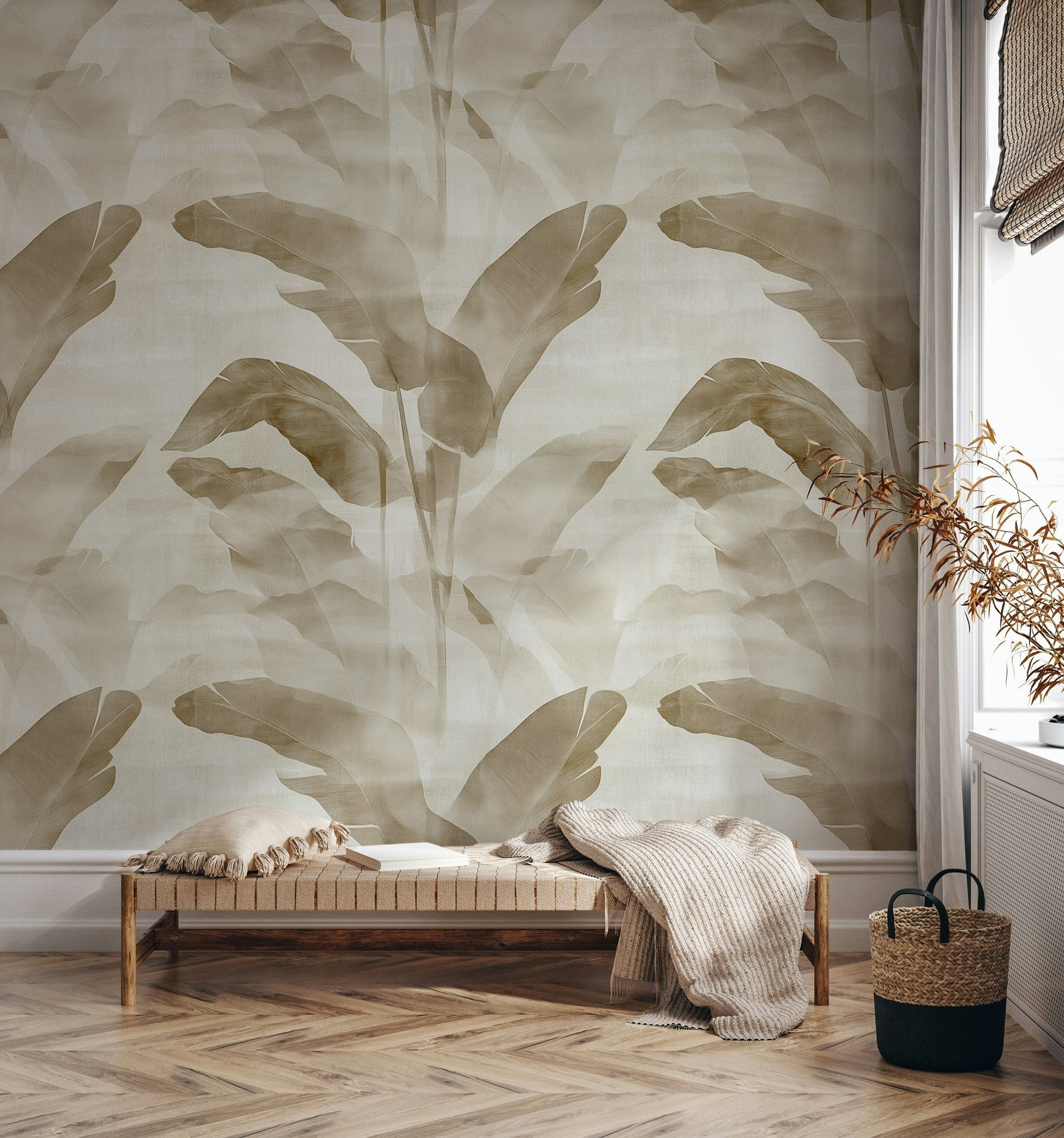 Elevate your interior decor with our stunning "Tropical Banana Leaf Wallpaper." Featuring a sophisticated beige and white color palette, this peel and stick wall mural brings a touch of nature indoors with its elegant botanical design. Perfect for living rooms, bedrooms, or any space in need of a serene and stylish update, this wallpaper is easy to apply and remove, making it an ideal choice for renters and homeowners alike. The intricate detailing of the banana leaves adds a subtle yet impactful statement to your walls, blending seamlessly with various decor styles.