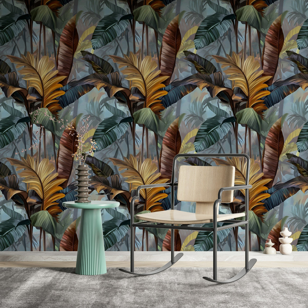 Lush tropical leaves in rich blue and brown tones cover this bold wallpaper, creating an immersive jungle feel. Each leaf is detailed with painterly strokes that add depth and dimensionality. This design brings the essence of the tropics into your home, making it ideal for feature walls that demand attention. Perfect for living room and bedroom spaces where you want to introduce a dramatic, nature-inspired element. The dark tone and bold pattern absorb light, enhancing the cozy atmosphere and providing a sense of layered texture. Designed to pair wonderfully with contemporary decor styles, this wallpaper complements dark wood furnishings, brass accents, and plush fabric upholstery, giving your space a modern yet lush aesthetic.