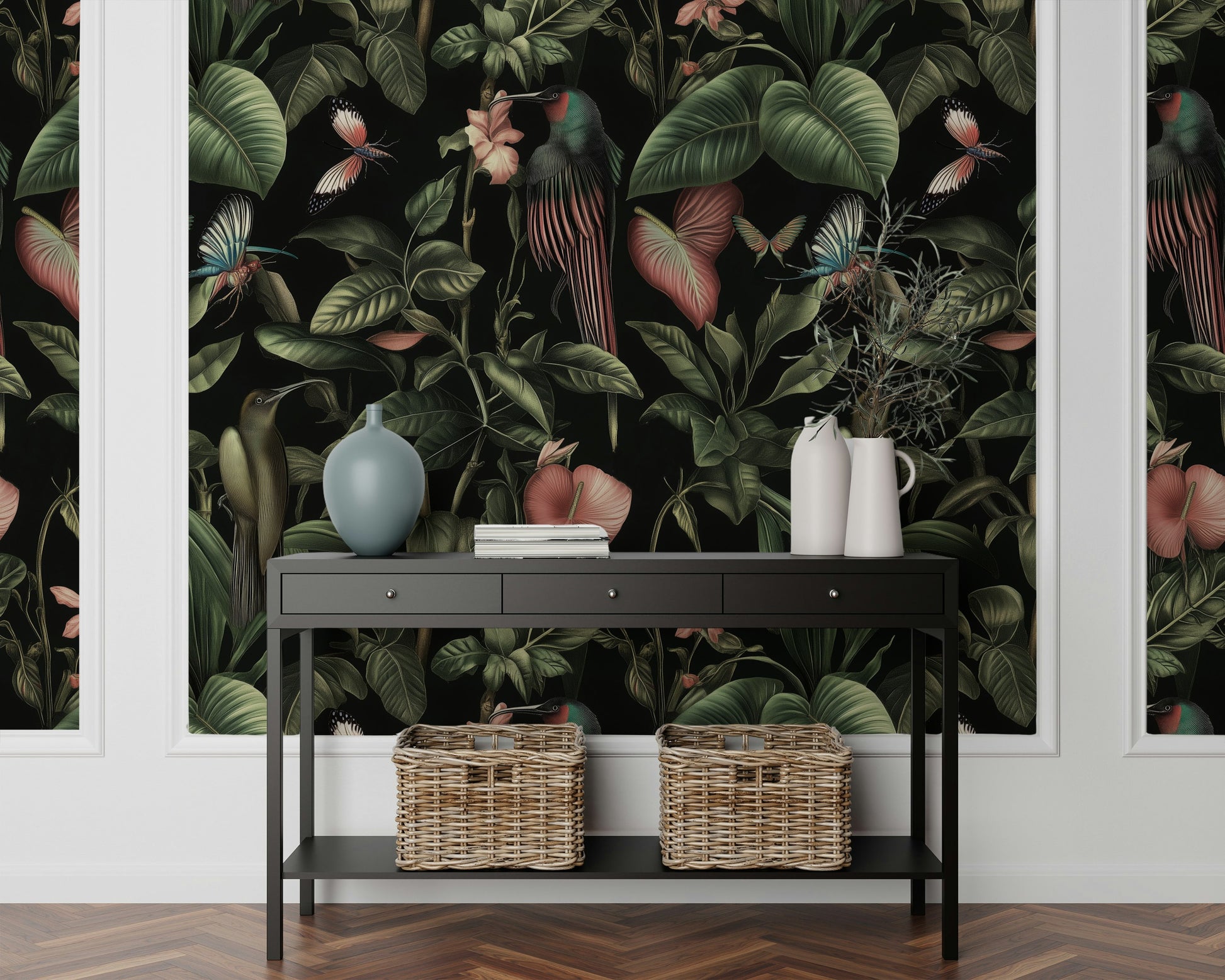 Transform your space into a mysterious and enchanting tropical paradise with this stunning nocturnal-themed wallpaper mural. Set against a rich, dark background, this design features lush, detailed illustrations of exotic birds, vibrant butterflies, and luxuriant tropical foliage. The intricate artwork showcases elegant herons or cranes, delicate pink flowers, and a variety of oversized, dramatic leaves in deep greens. Colorful butterflies add a touch of whimsy and movement to the scene. This wallpaper creates a sophisticated, moody atmosphere perfect for bedrooms, dining rooms, or statement walls in living areas. The high-quality print brings depth and texture to your walls, inviting the beauty and mystery of a nighttime tropical garden into your home.