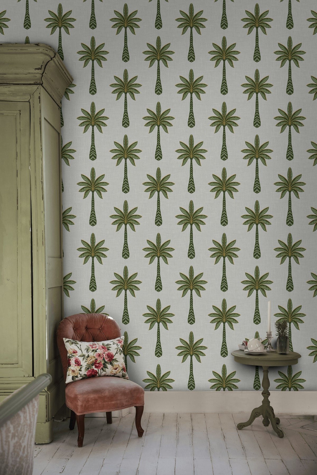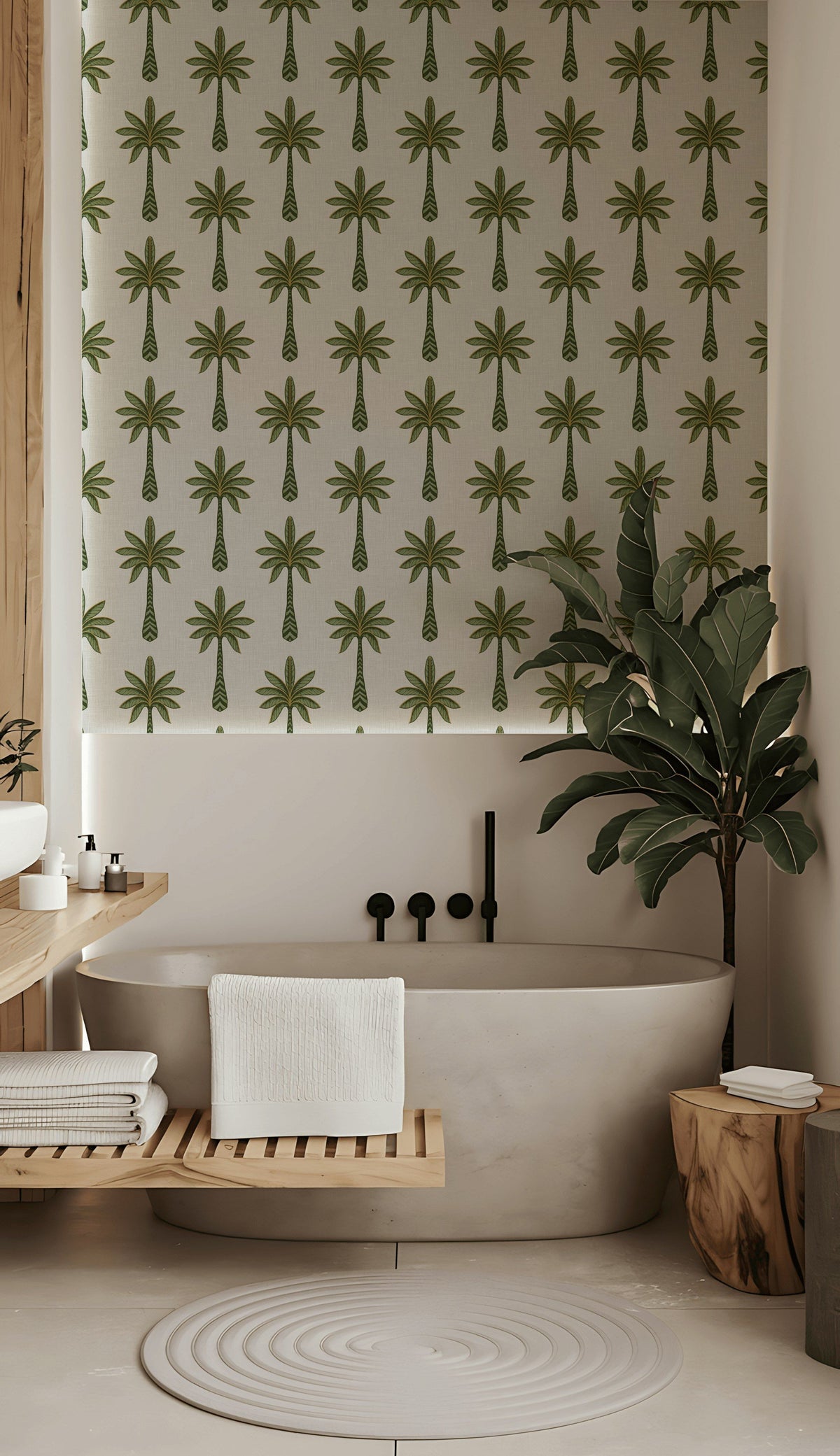 The uniqueness of this wallpaper lies in its detailed leaf work, where each palm tree is meticulously illustrated to create a balanced pattern that brings a light and airy presence, enhancing natural light and uplifting any room's atmosphere.