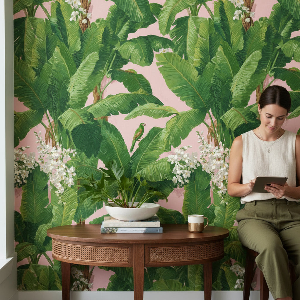 This vibrant wallpaper shows tropical foliage with banana leaves and exotic birds against a pink background. The design includes lush greenery and floral elements, perfect for a lively atmosphere.