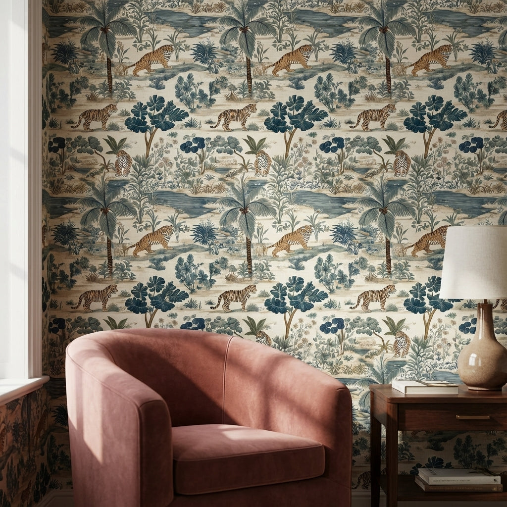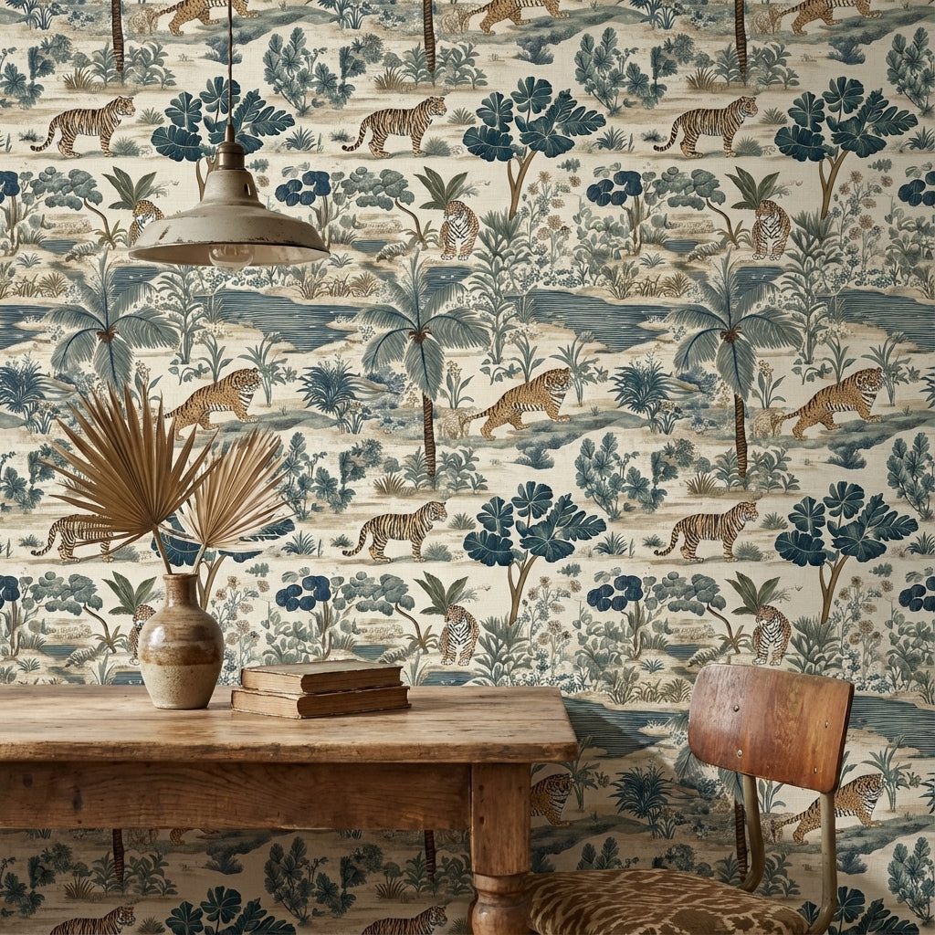 This vintage wallpaper depicts an exotic scene with tigers amidst lush tropical foliage. The design includes green and brown tones, creating an illustrative natural setting.
