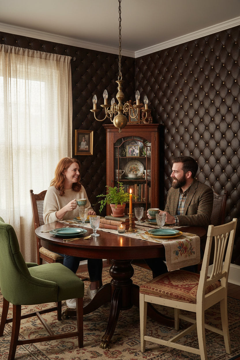 The dark tones of the quilted abstract wallpaper pair beautifully with vintage decor, adding a rich and moody ambiance that complements antique furnishings and classic elements.