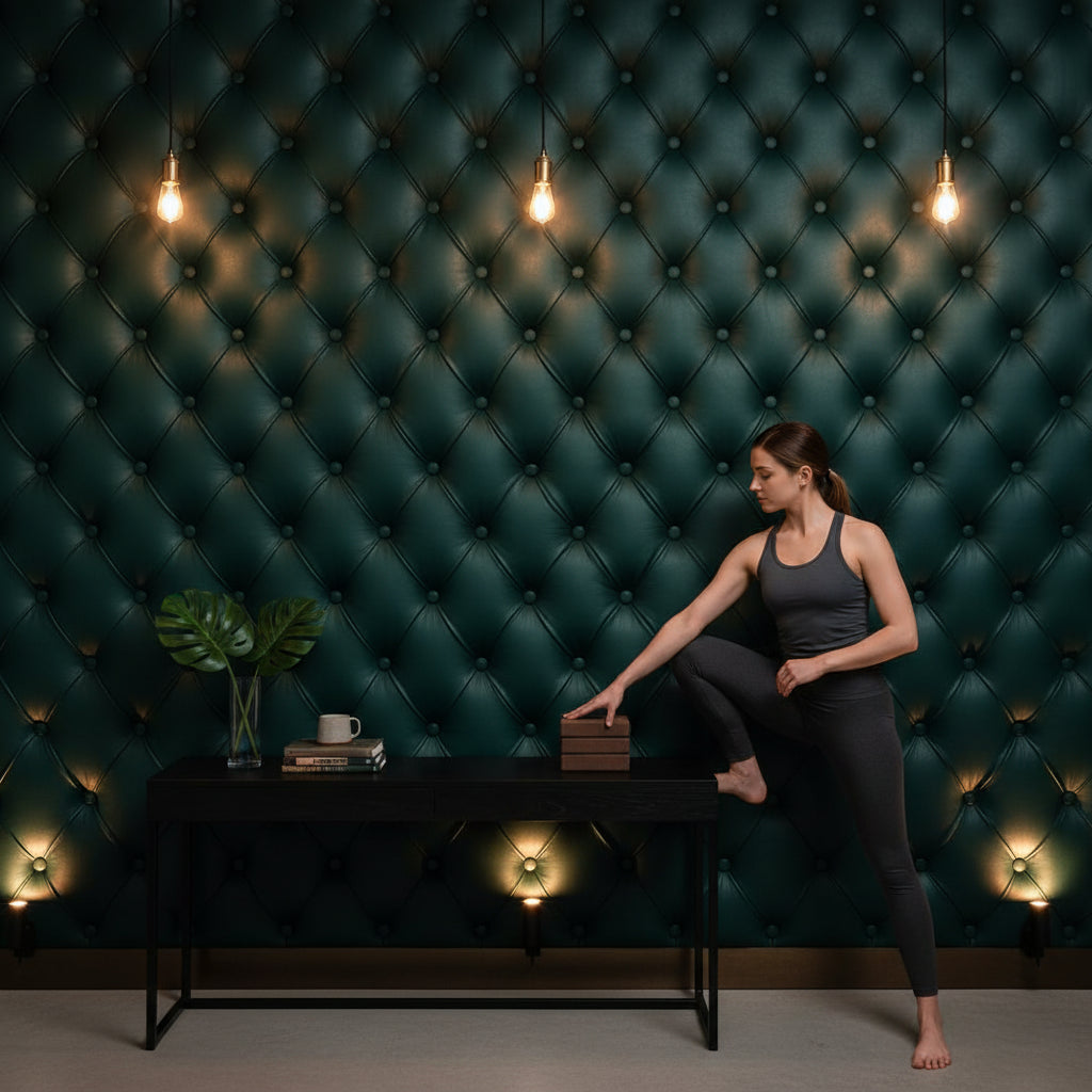 The button-tufted effect of the Dark Teal Quilted Texture 3D Wallpaper creates a plush upholstery look that adds a distinctive element of luxury and depth. This feature makes it stand out as a unique design element that enhances any room's elegance and sophistication.