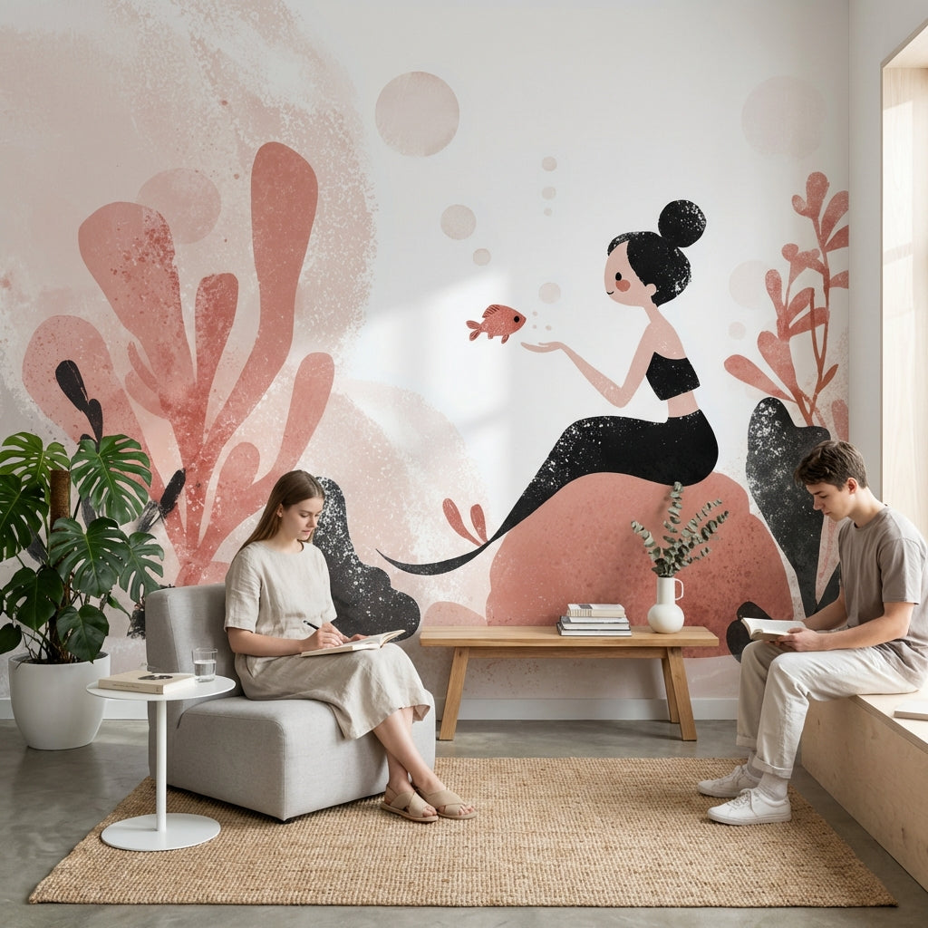 This mural shows a playful mermaid surrounded by abstract plants and fish, rendered in soft peach and grey tones. The modern style and whimsical elements make it a unique choice for aquatic-themed decor.