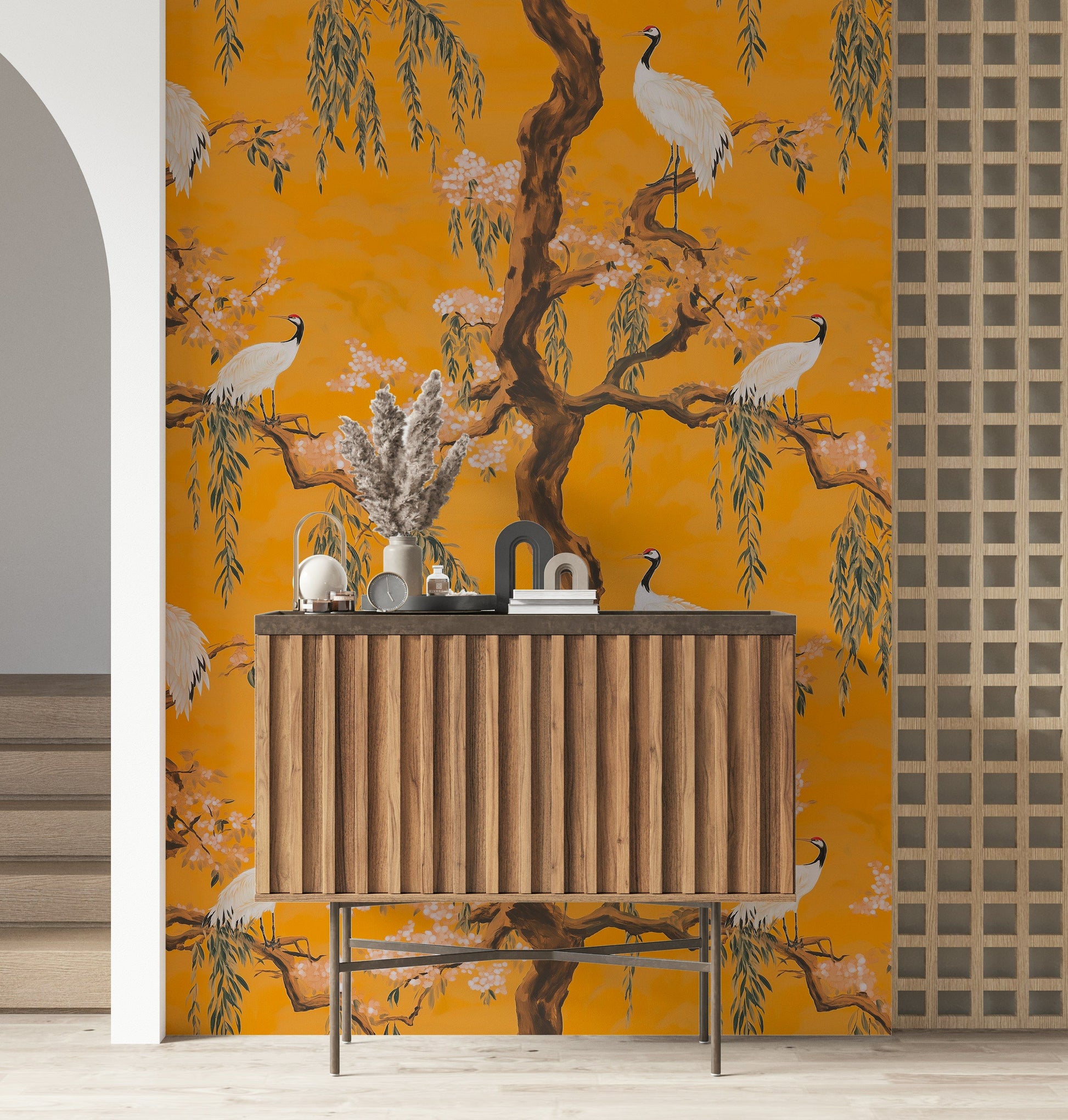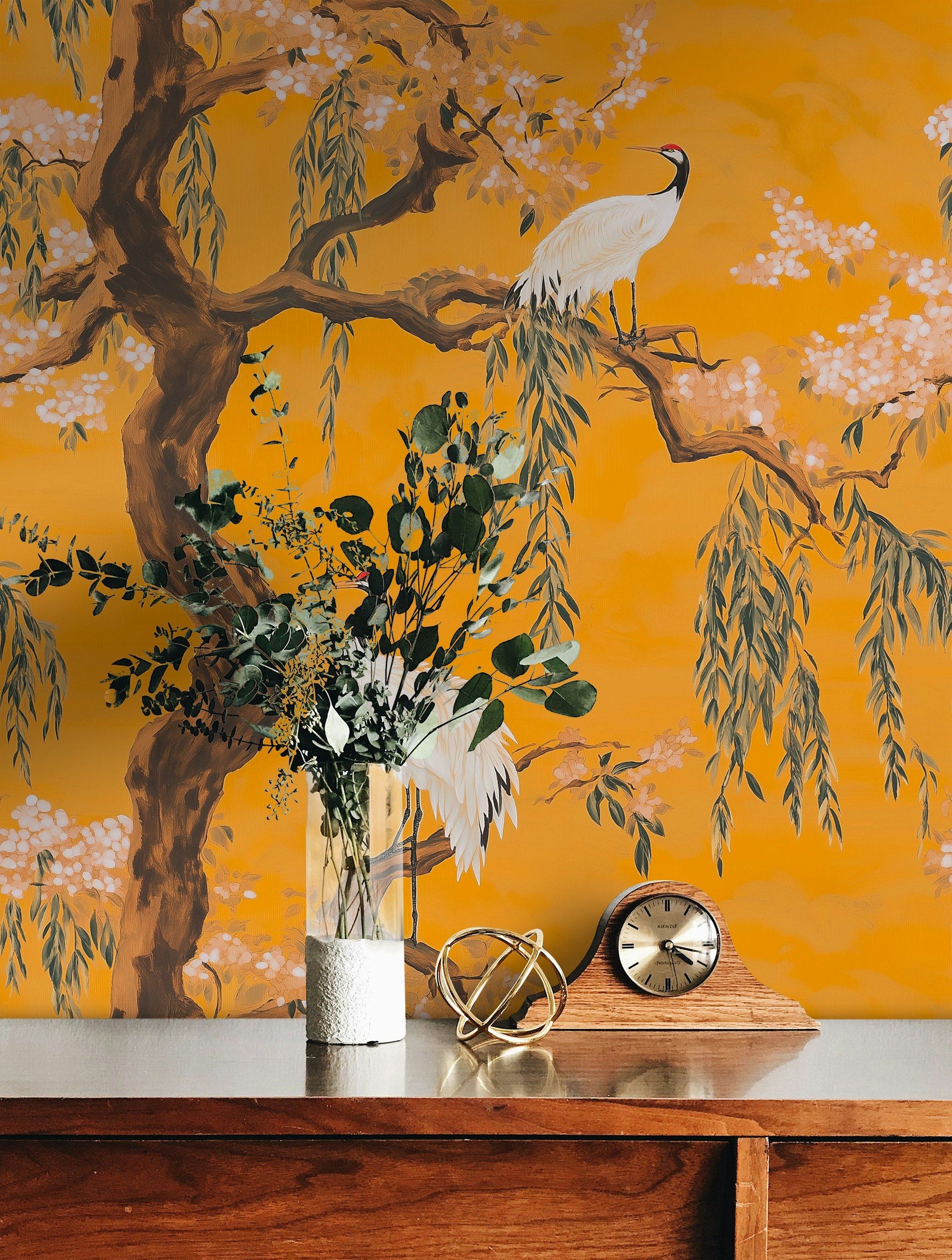 Vibrant Crane and Cherry Blossom Wallpaper Asian Style Decor