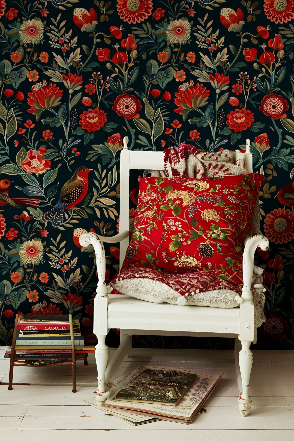 This wallpaper complements bohemian and modern styles, thanks to its vivid red flowers and intricate bird patterns. The large floral motifs and dark tone can add an exotic and sophisticated touch to your decor.