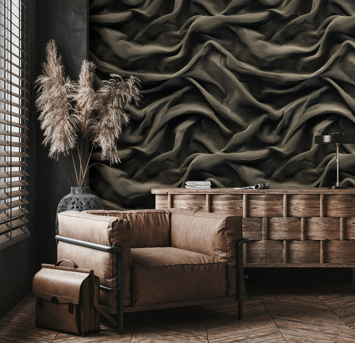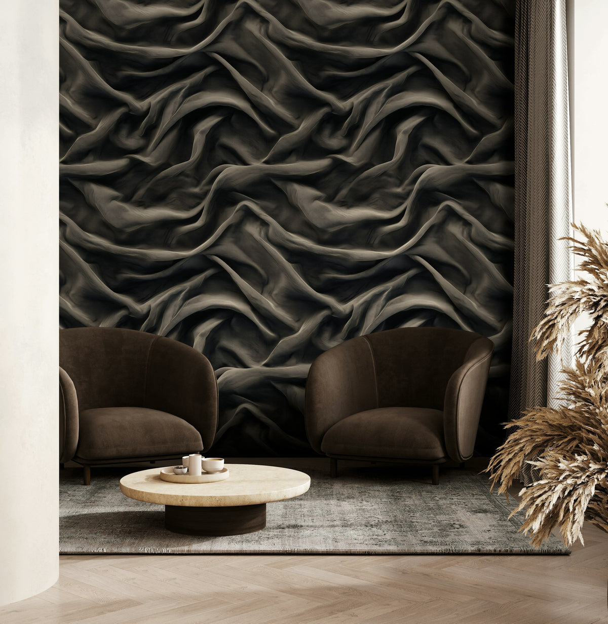 This wallpaper complements modern decor with its large-scale abstract pattern and dark tones. The luxurious feel of the draped texture pairs well with contemporary furniture and velvet upholstery, making it a standout feature in any modern space.