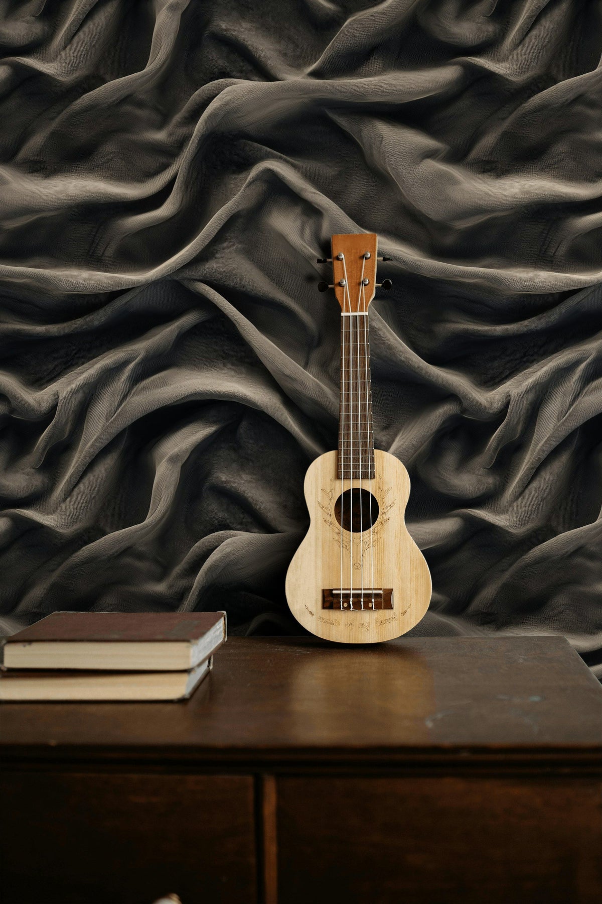 The Dark Abstract Draped Texture Wallpaper adds depth and texture to any home office. Its dark tones and medium pattern density create an elegant backdrop that enhances focus and adds a touch of luxury to workspaces.