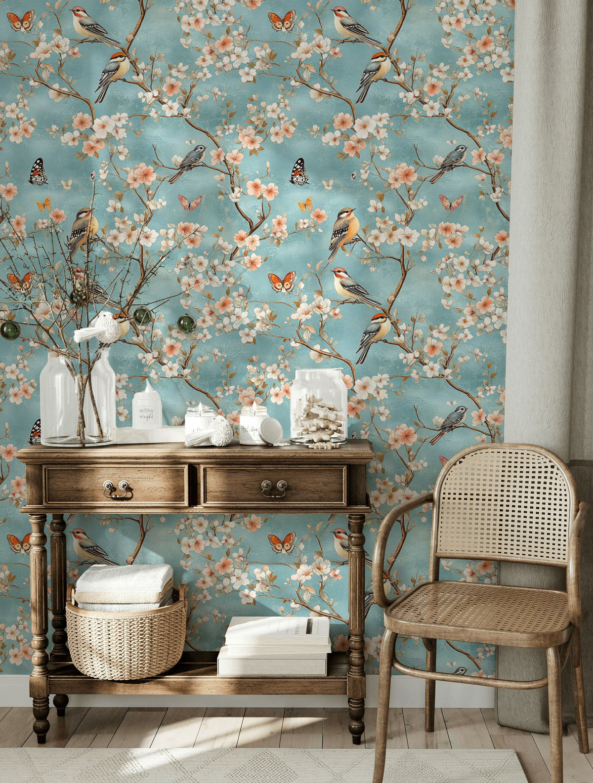 The Sky Blue Cherry Blossom and Bird Wallpaper stands out due to its delicate interplay of cherry blossoms and detailed birds against a sky blue backdrop. This medium-scale pattern offers a refreshing and inviting ambiance, unlike more generic floral designs.