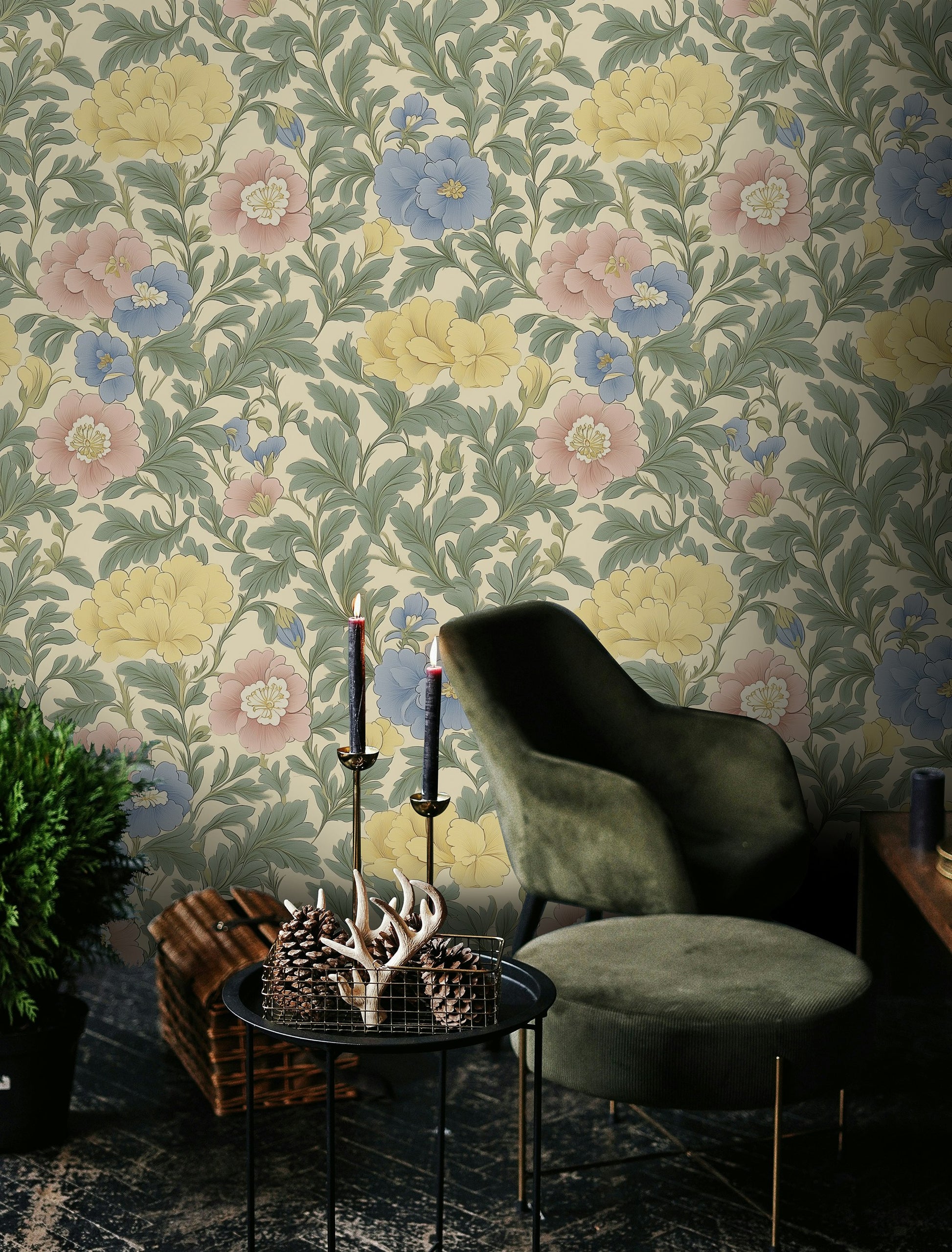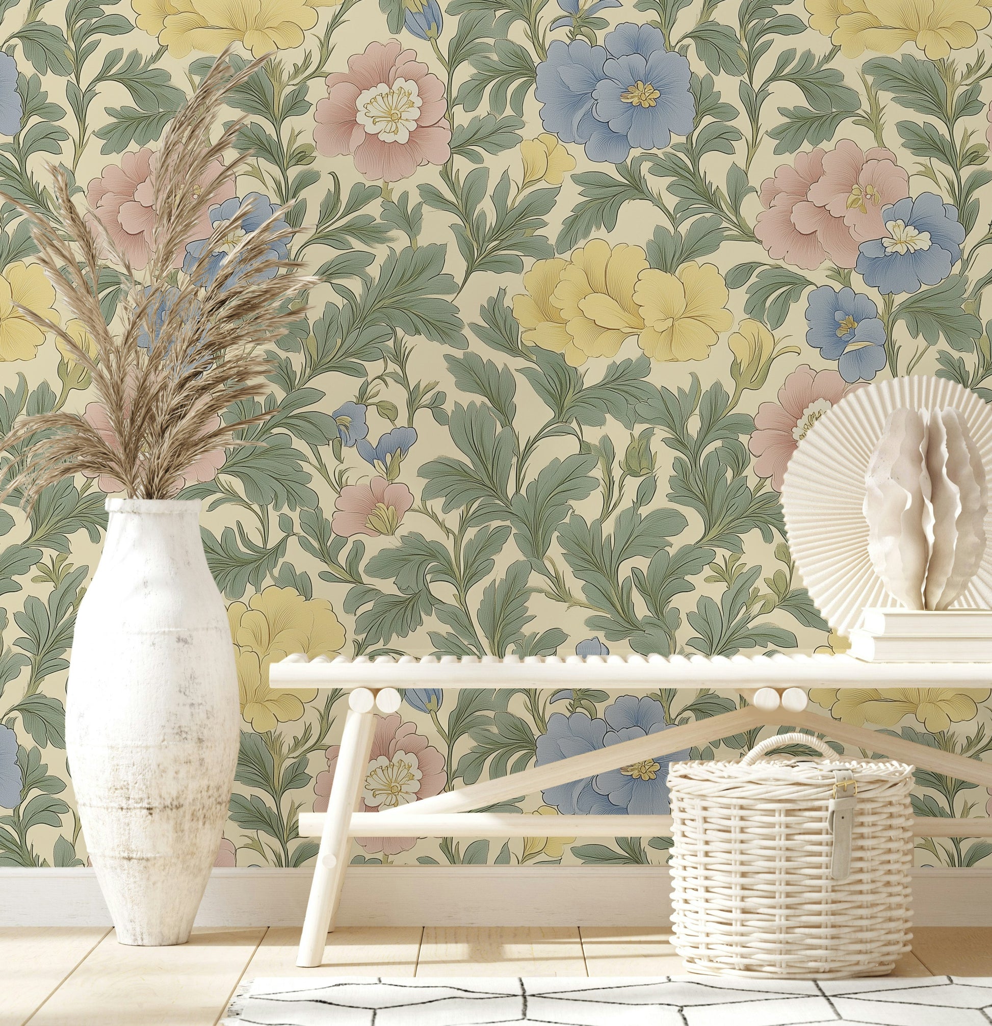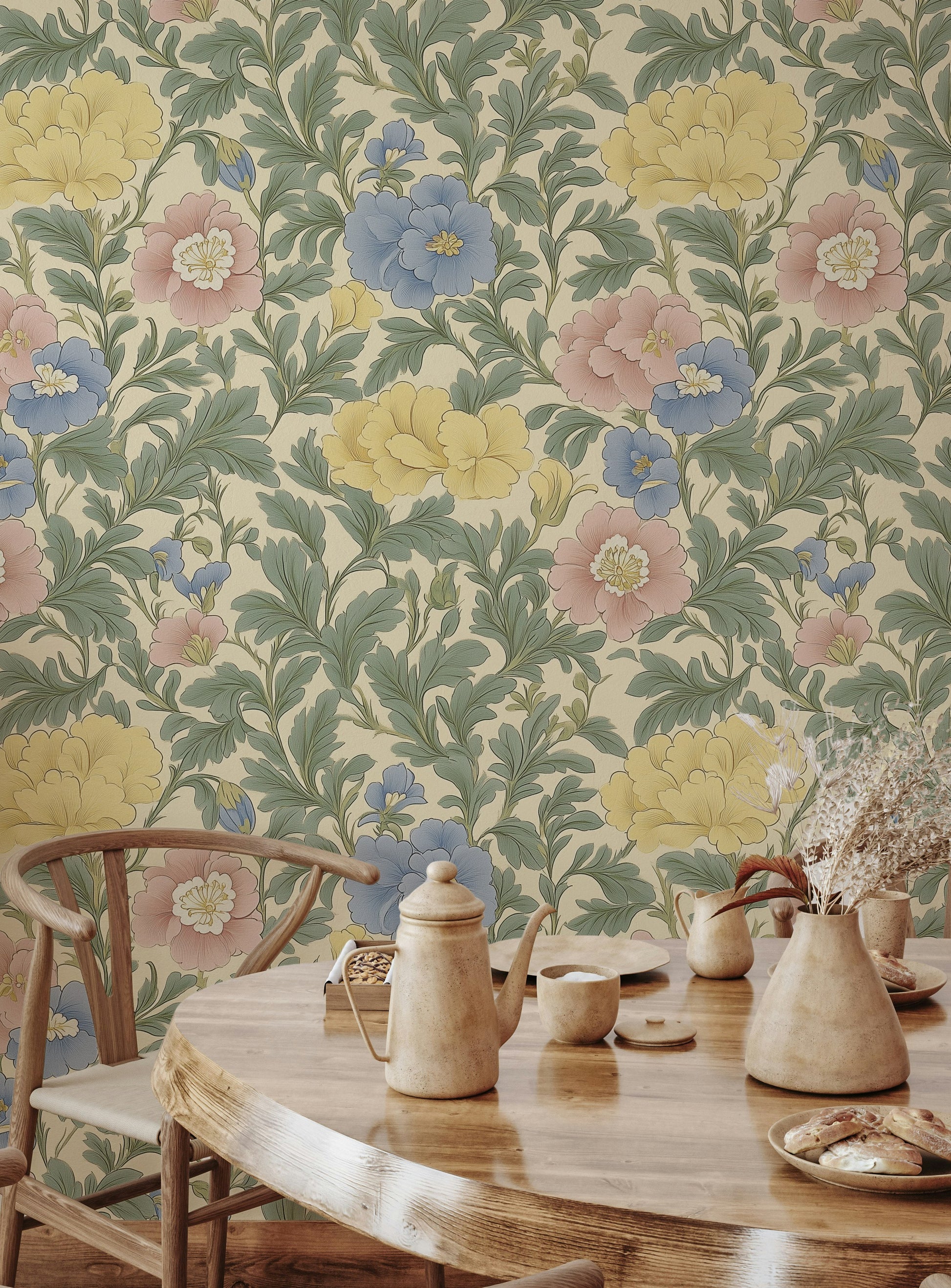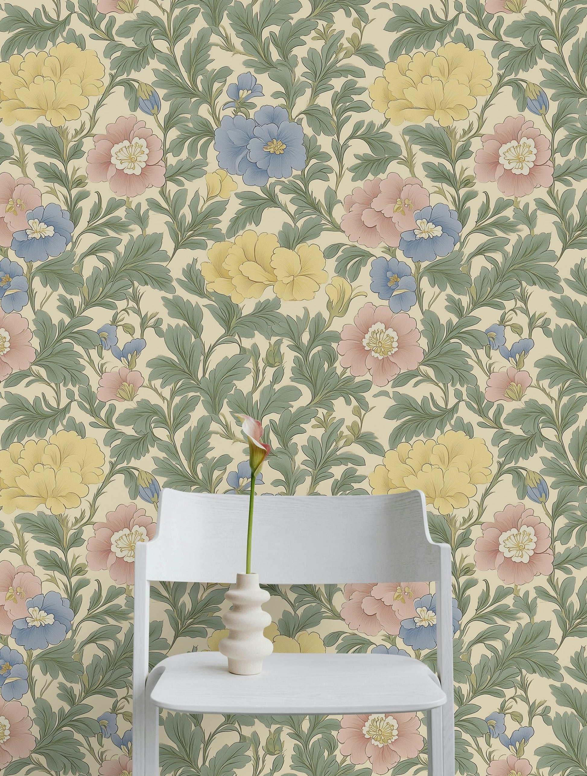 Transform your space with the timeless charm of our Vintage Botanical Elegance Wallpaper. This exquisite mural features a delicate array of soft pastel flowers in shades of yellow, blue, and pink, set against a soothing cream background. Lush green foliage intertwines with the blooms, creating a harmonious and natural pattern that evokes the grace of classic botanical illustrations. The gentle color palette and intricate floral designs make this wallpaper perfect for creating a serene and sophisticated atmosphere in bedrooms, living rooms, or dining areas. Inspired by traditional English garden motifs, this wallpaper adds a touch of vintage romance and refined elegance to any interior, seamlessly blending with both classic and contemporary decor styles.