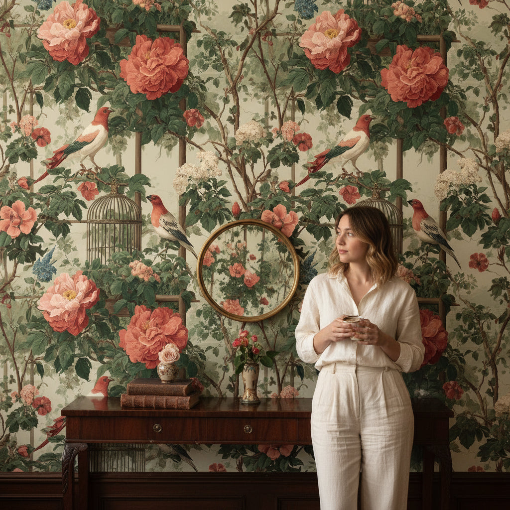 The botanical theme of this wallpaper, featuring lush roses and birds, complements traditional living room decor by adding a touch of natural elegance and timeless beauty. Its large-scale floral pattern blends seamlessly with classic furniture and heritage-style interiors.
