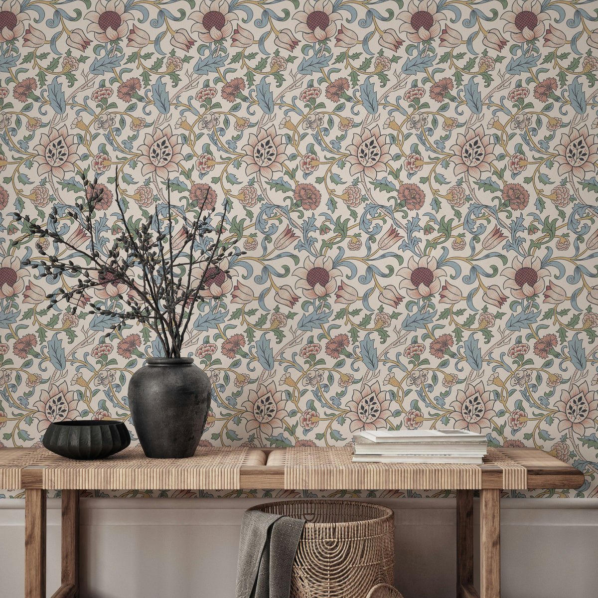 This wallpaper shows a repeating vintage floral pattern with curling vines, blue leaves, and soft pink flowers on a light cream background. The design has fine linework and muted, antique-inspired colors. It suits living rooms, bedrooms, and dining rooms.