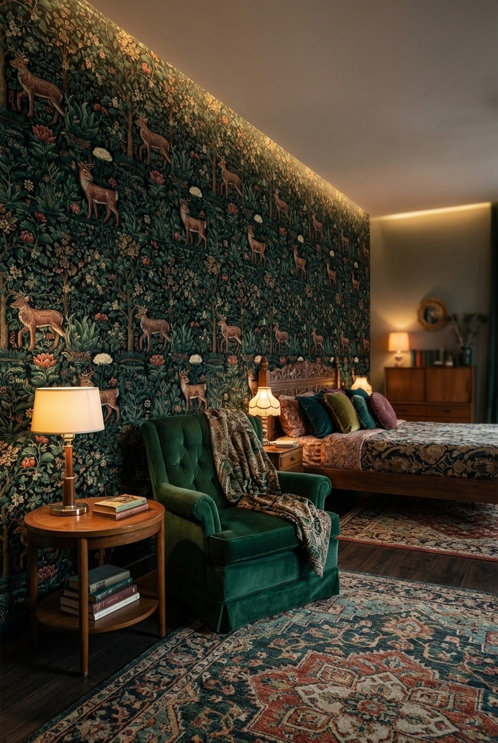This vintage wallpaper includes deer among vibrant flowers and dense foliage. The design has rich green, brown, and red tones that evoke a traditional forest scene.