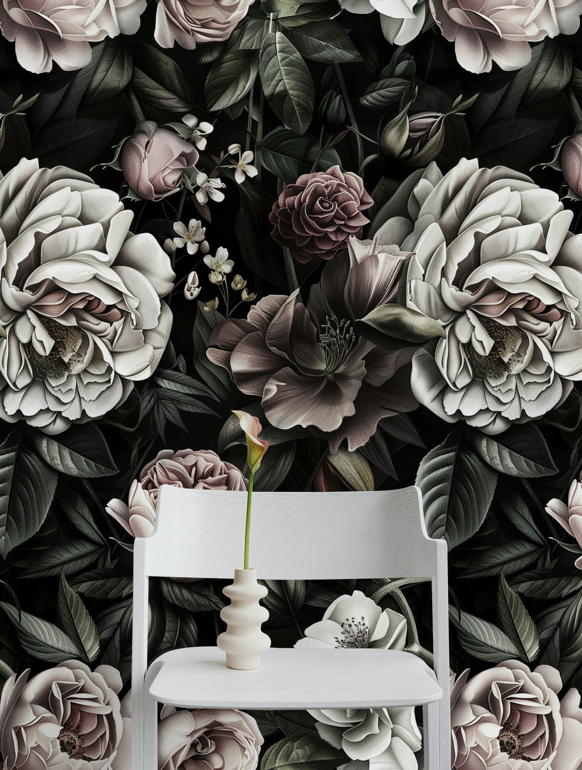 Elevate your interior with this striking vintage floral wallpaper mural, featuring a dark and moody design of lush roses and foliage. The rich, deep tones of this peel and stick wall art create a dramatic and sophisticated ambiance, perfect for making a bold statement in any room. Ideal for living rooms, bedrooms, or accent walls, this mural brings timeless elegance and a touch of mystery to your decor. The detailed artwork and high-quality material ensure an easy application and long-lasting beauty.