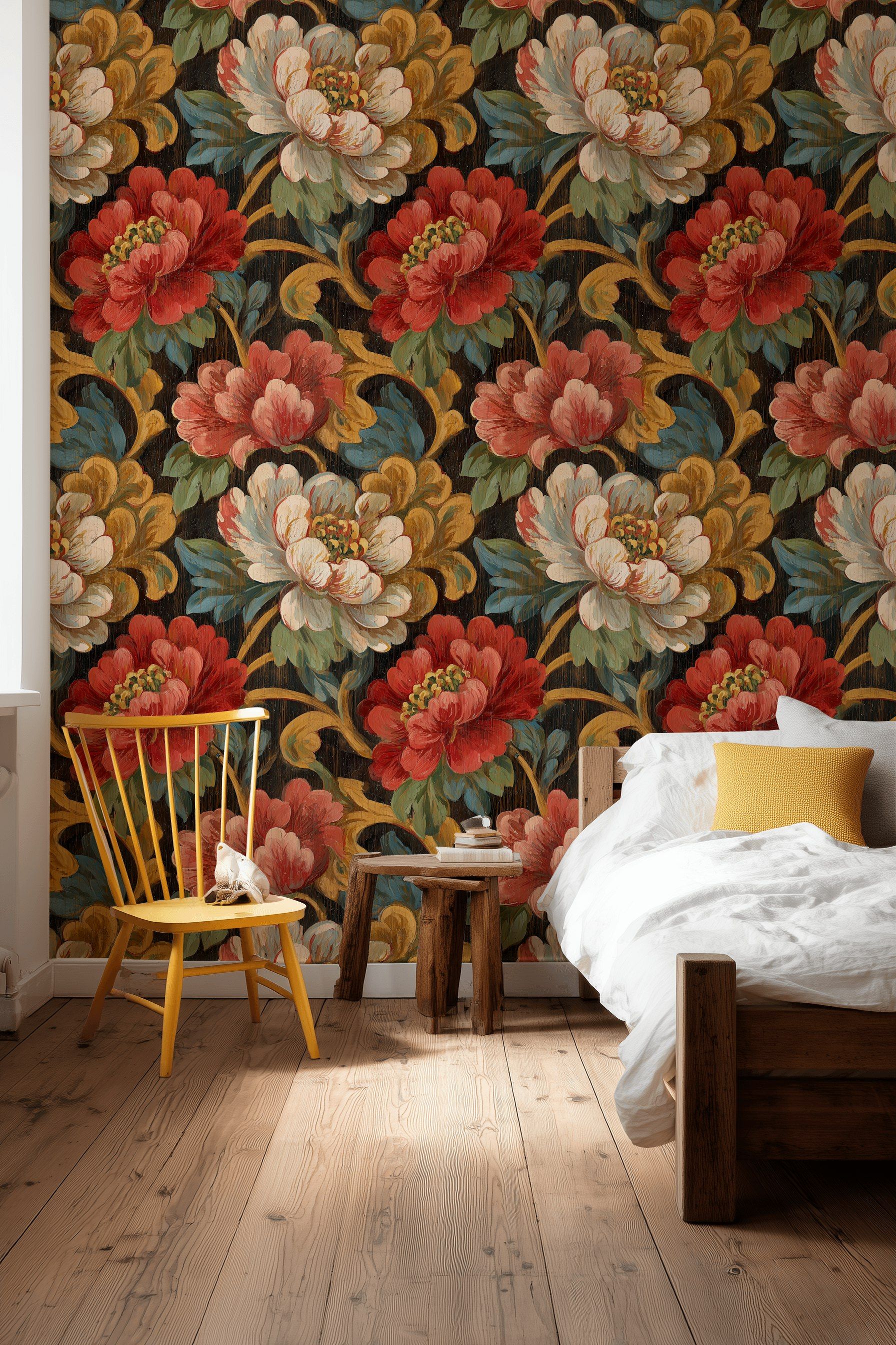 Large-scale painted peonies and swirling baroque vines stand out against a dark woodgrain effect. Deep red, gold, and ivory petals give this floral wallpaper a classic vintage look, with brushstroke details that mimic hand-painted art.
