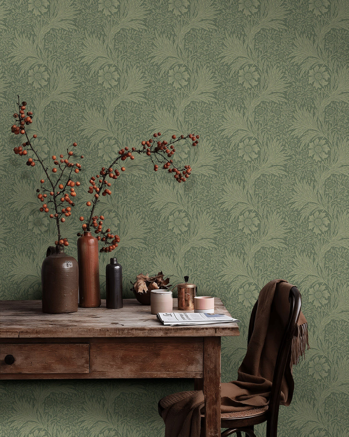 This wallpaper shows a repeating botanical pattern with stylized flowers, leaves, and curved foliage in sage green. The design has an etched, vintage look with medium density detailing. It suits living rooms, bedrooms, and dining rooms that use natural wood and muted tones.
