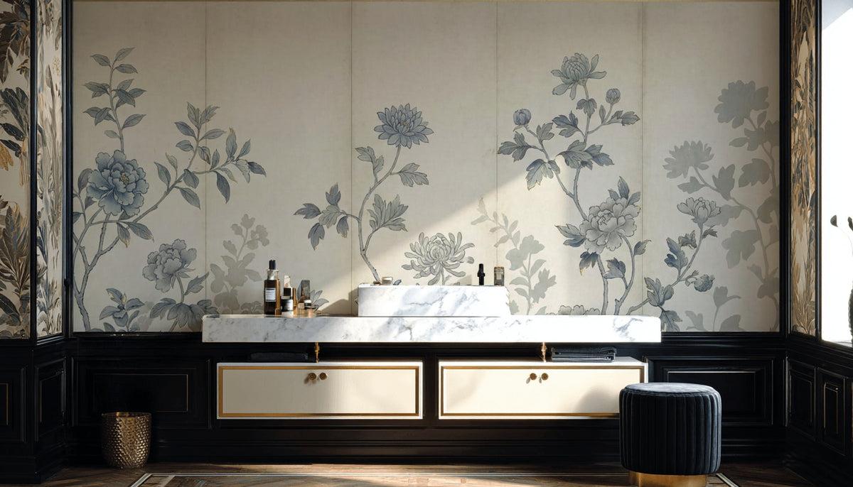 This wallpaper features vintage floral elements in soothing blue, grey, and beige tones. The elegant design includes flowers, leaves, and branches, creating a peaceful and traditional ambiance.