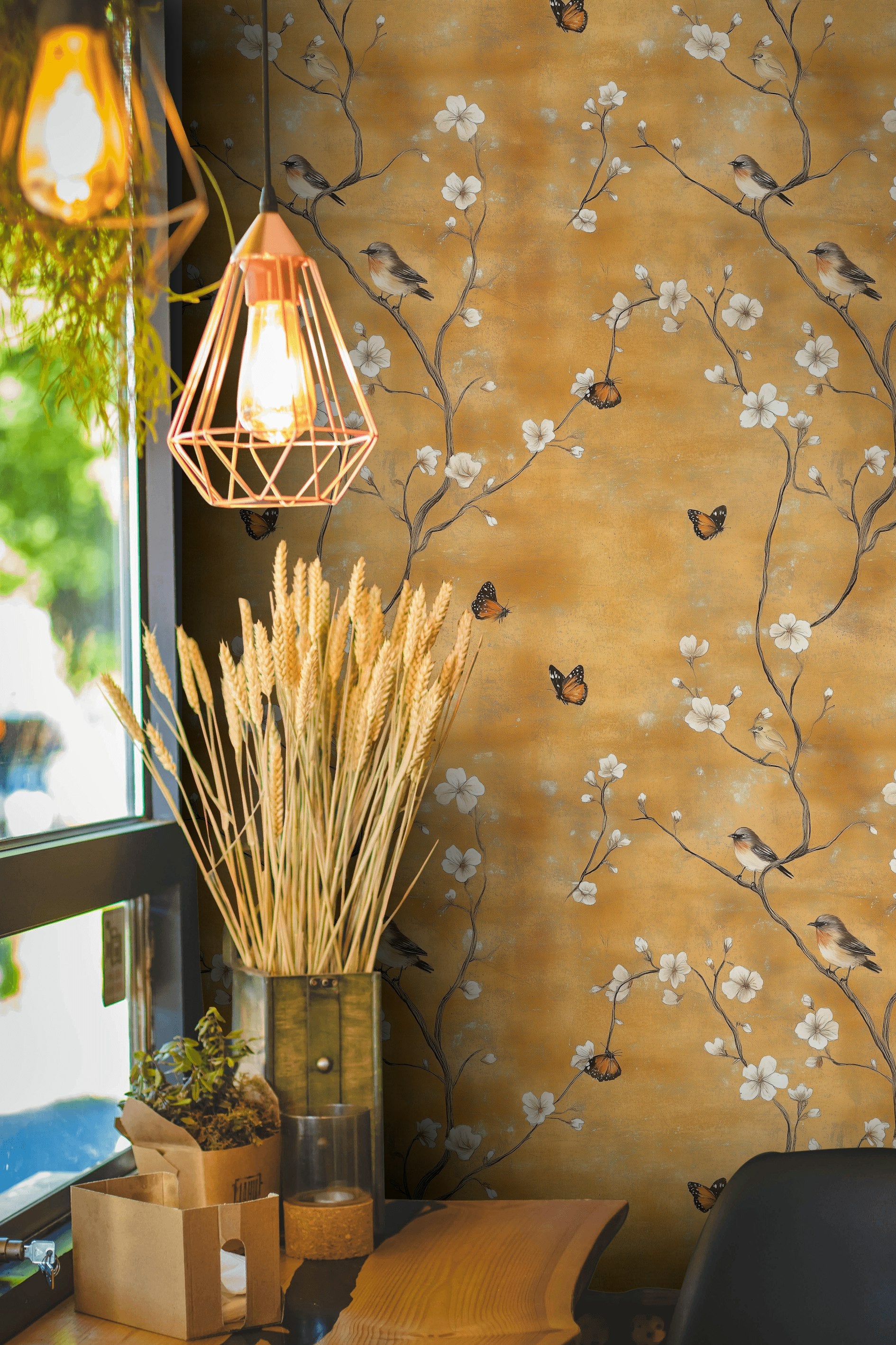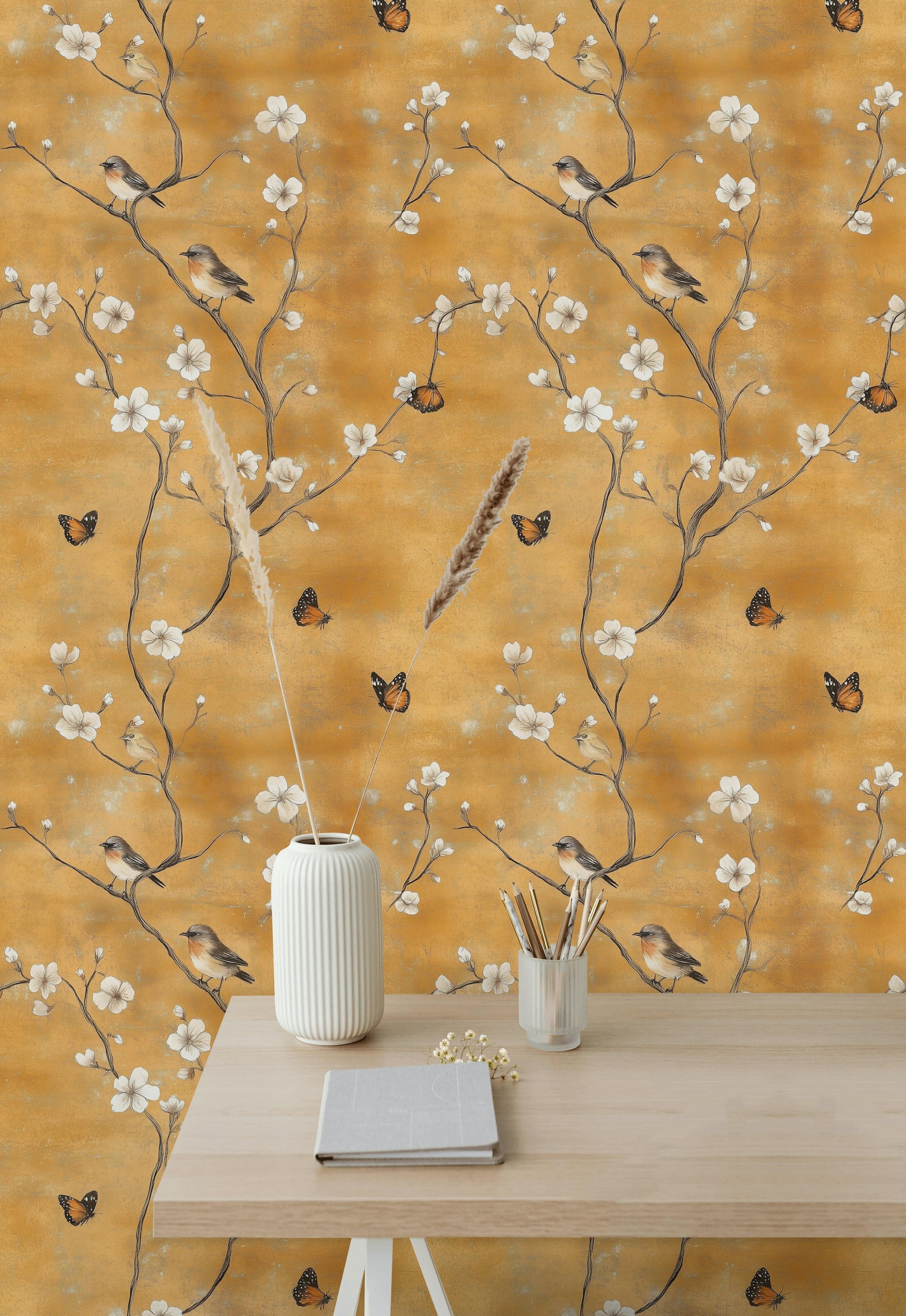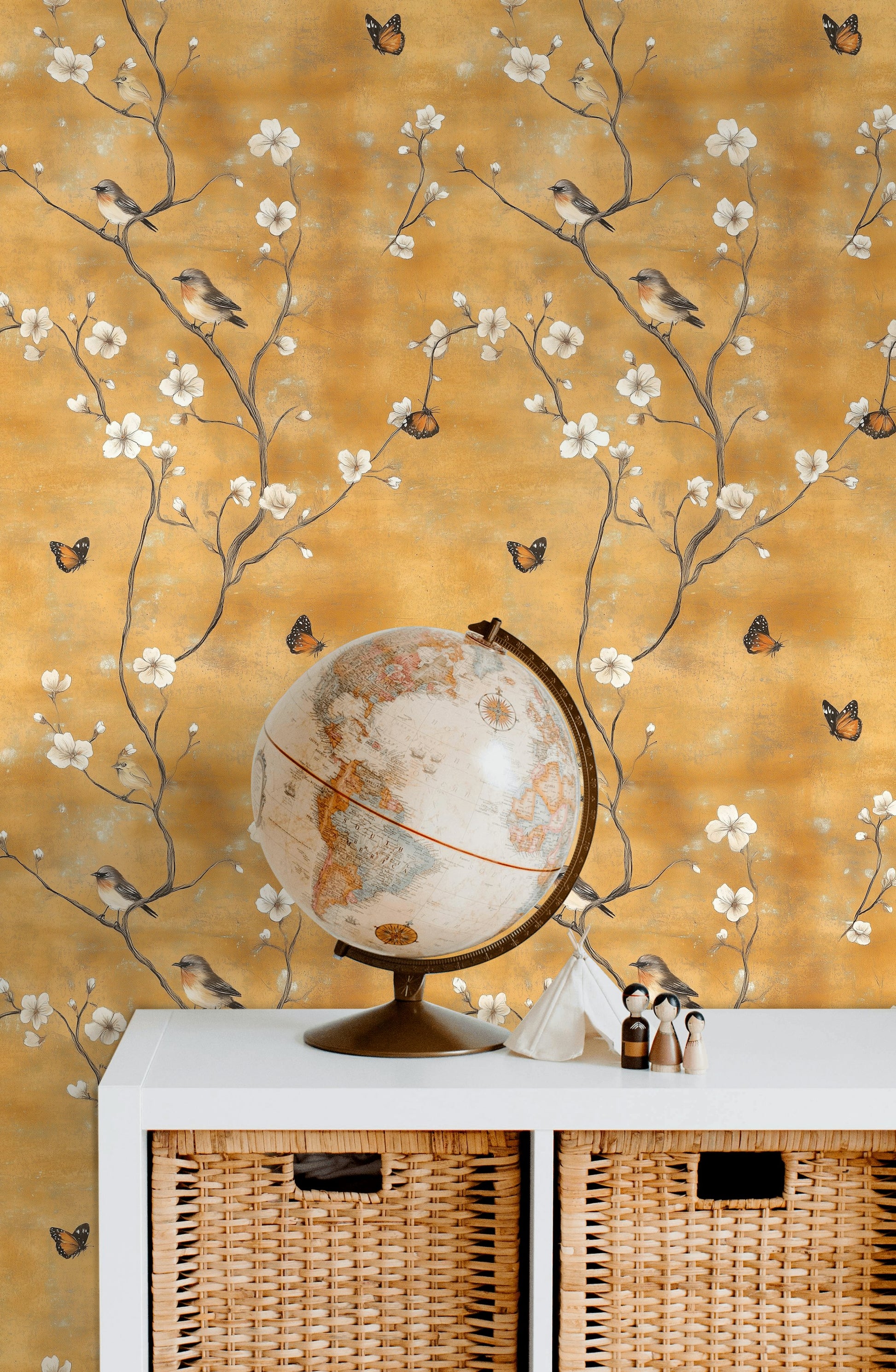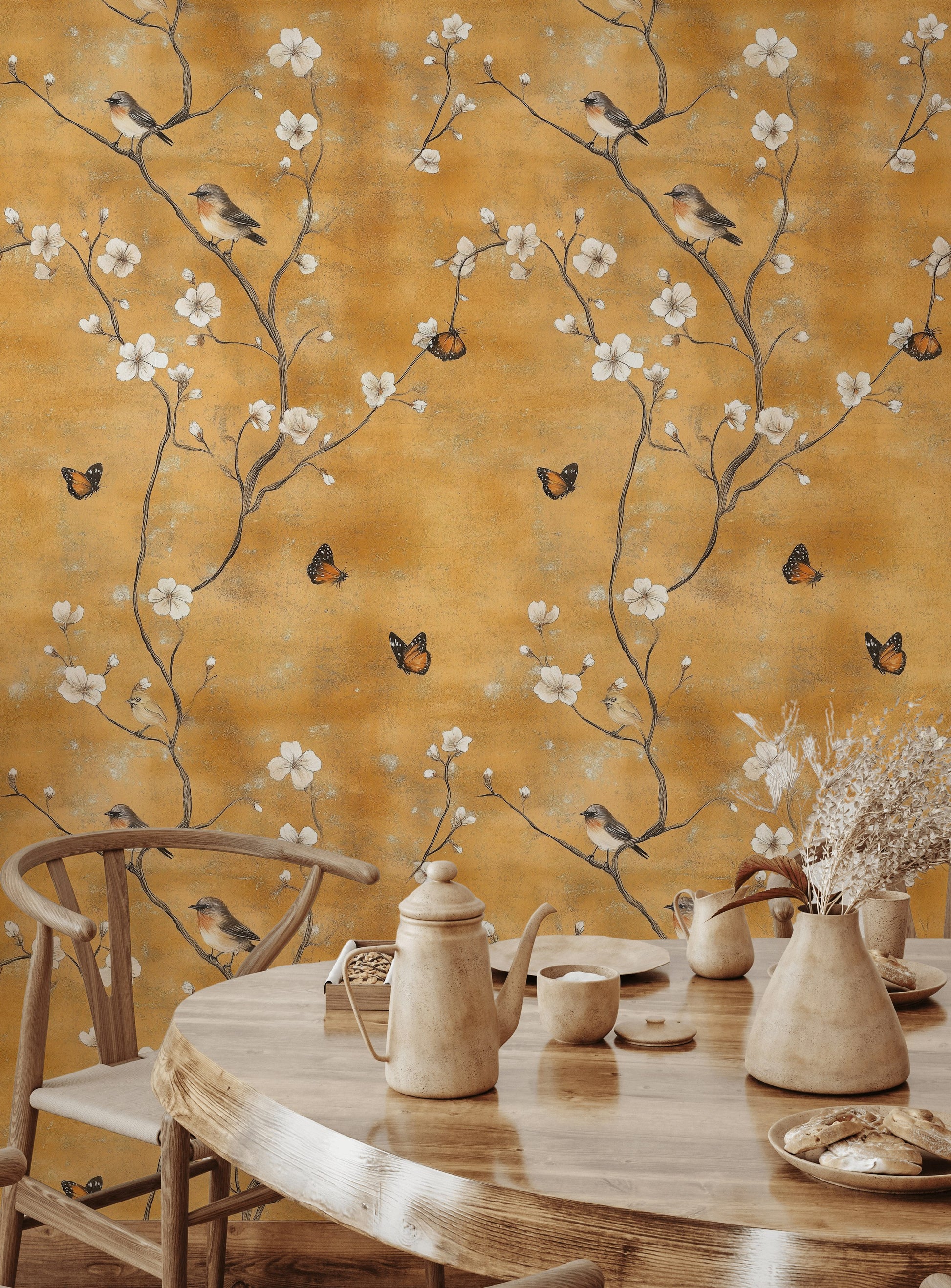 Transform your space with our enchanting vintage-inspired wallpaper featuring delicate white blossoms, charming birds, and graceful butterflies against a rich golden backdrop. This elegant design brings a touch of nature's beauty indoors, creating a serene and sophisticated atmosphere in any room. Perfect for bedrooms, living areas, or accent walls, this high-quality wallpaper adds depth and character to your interior decor.