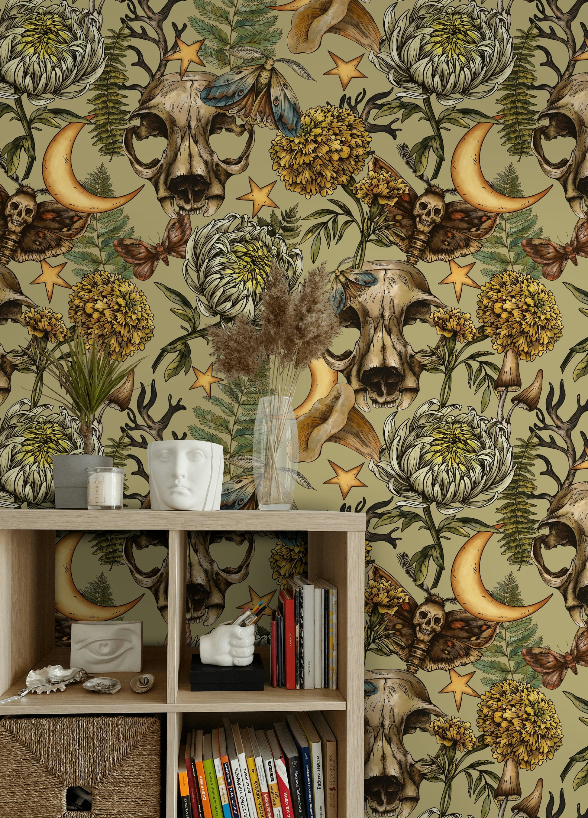 Add a touch of mystical elegance to your space with this vintage-inspired Gothic wallpaper featuring a sage green background. This stunning design combines anatomical skulls with delicate chrysanthemums and white blooms, complemented by golden celestial elements. Beautiful moths and fern details create a harmonious balance between nature and Gothic aesthetics.