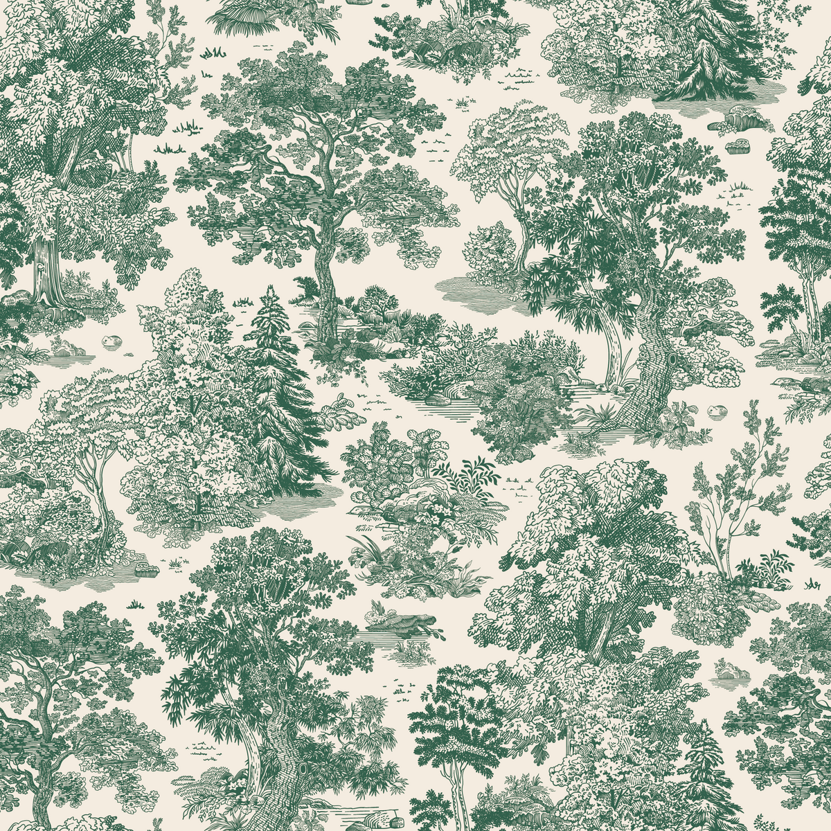 Rendered in a timeless toile pattern, this wallpaper features intricate green botanical illustrations on a warm beige background. Ideal for adding a subtle touch of nature to traditional or rustic interiors. The medium-scale design works wonderfully as a feature wall in living rooms or home offices, offering a serene ambiance. Complements wood furniture and vintage décor pieces beautifully.