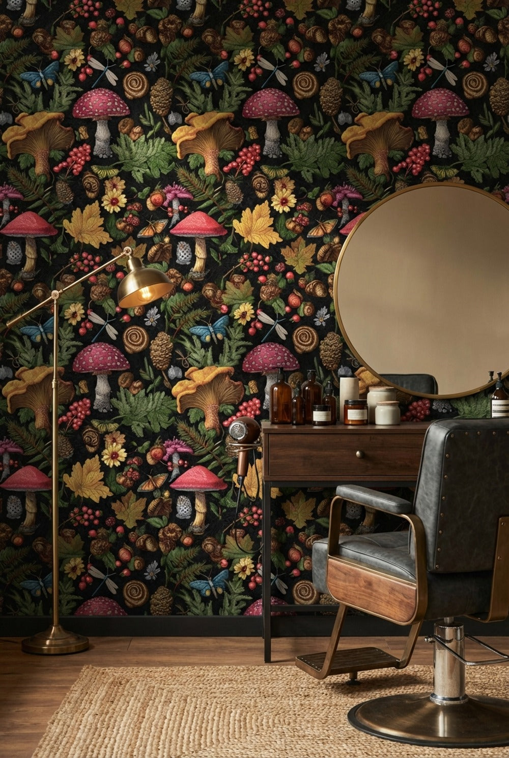 This vintage-inspired wallpaper showcases an array of mushrooms, leaves, and insects in a botanical style. The rich hues of green, brown, red, and blue create a natural and eclectic look.
