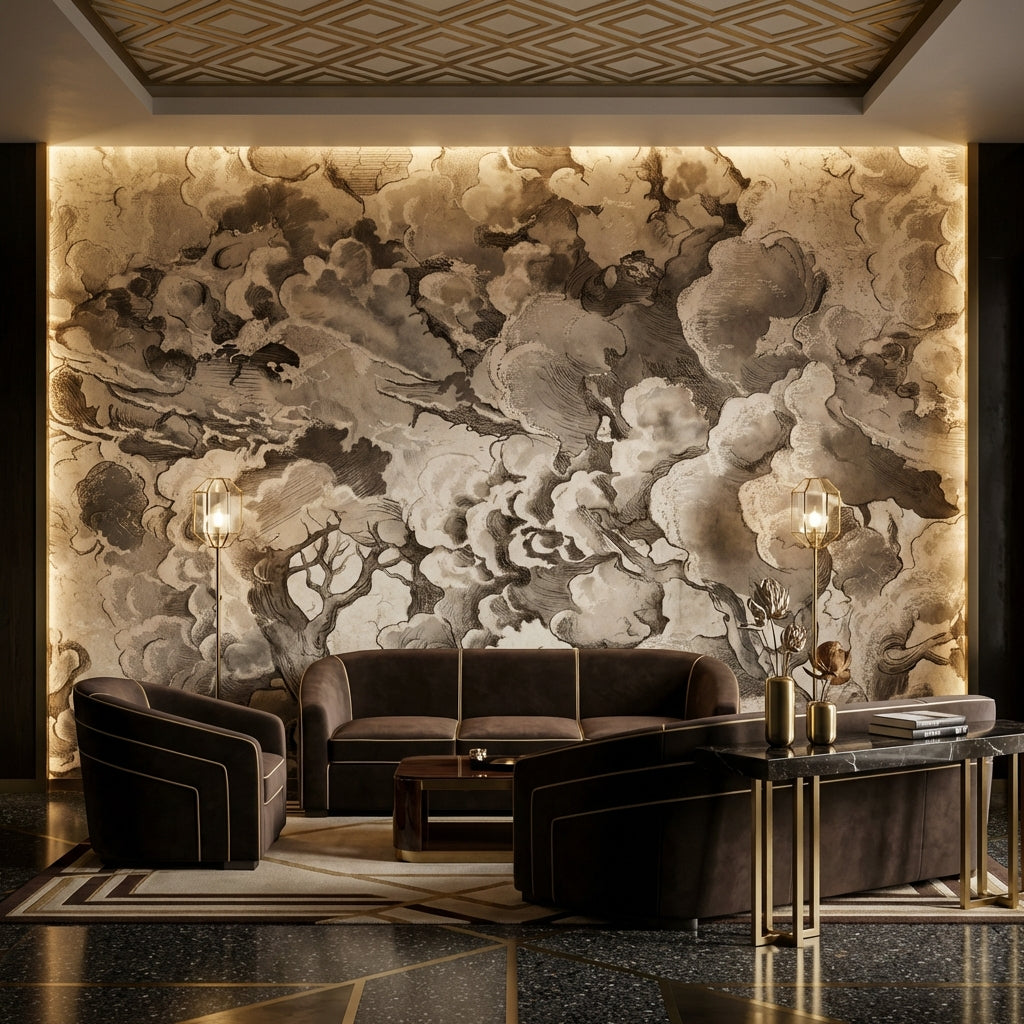 This elegant mural shows a vintage style with abstract clouds and tree branches. The sepia tones and moody design work beautifully for classic decor settings.