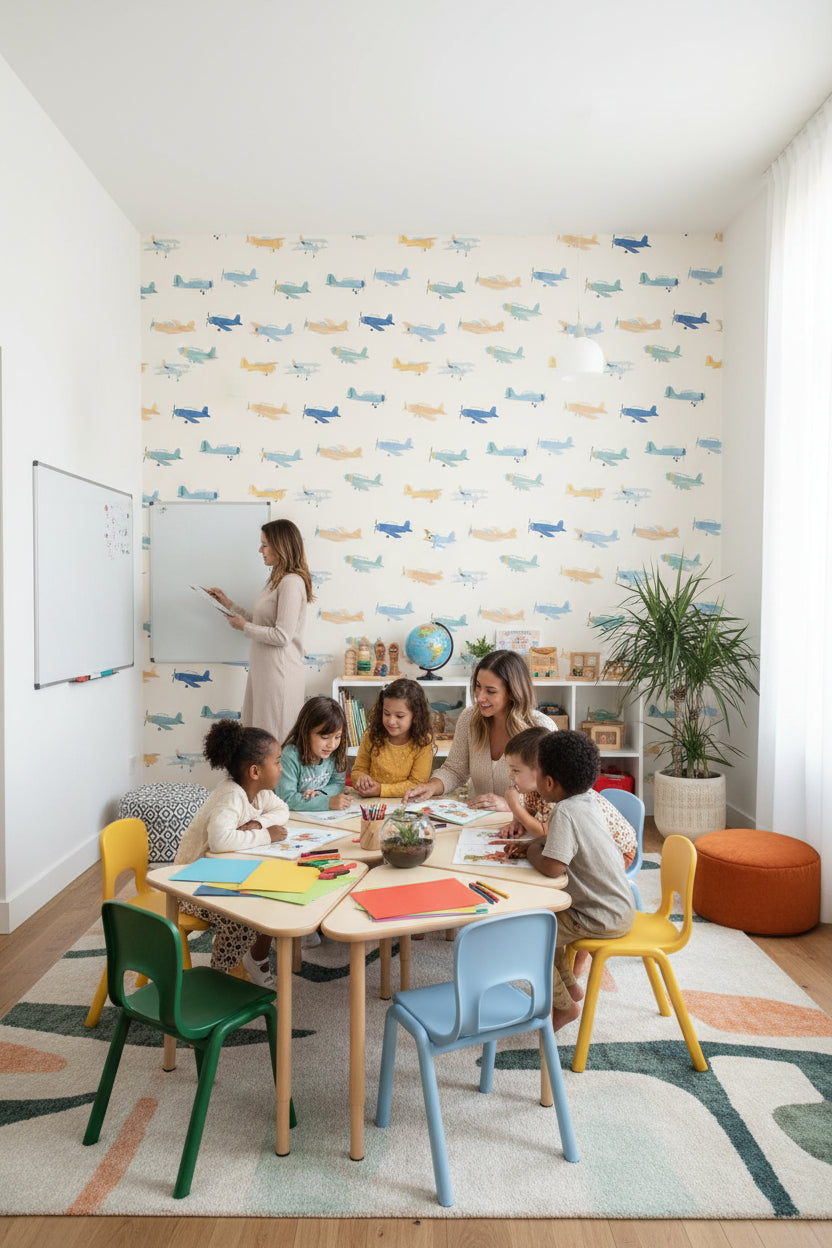 The contemporary style of the Cream and Blue Cartoon Airplanes Kids Wallpaper complements modern children's furniture beautifully. Its light cream tones and vibrant blue and orange airplanes add a touch of adventure while maintaining a clean, modern look.