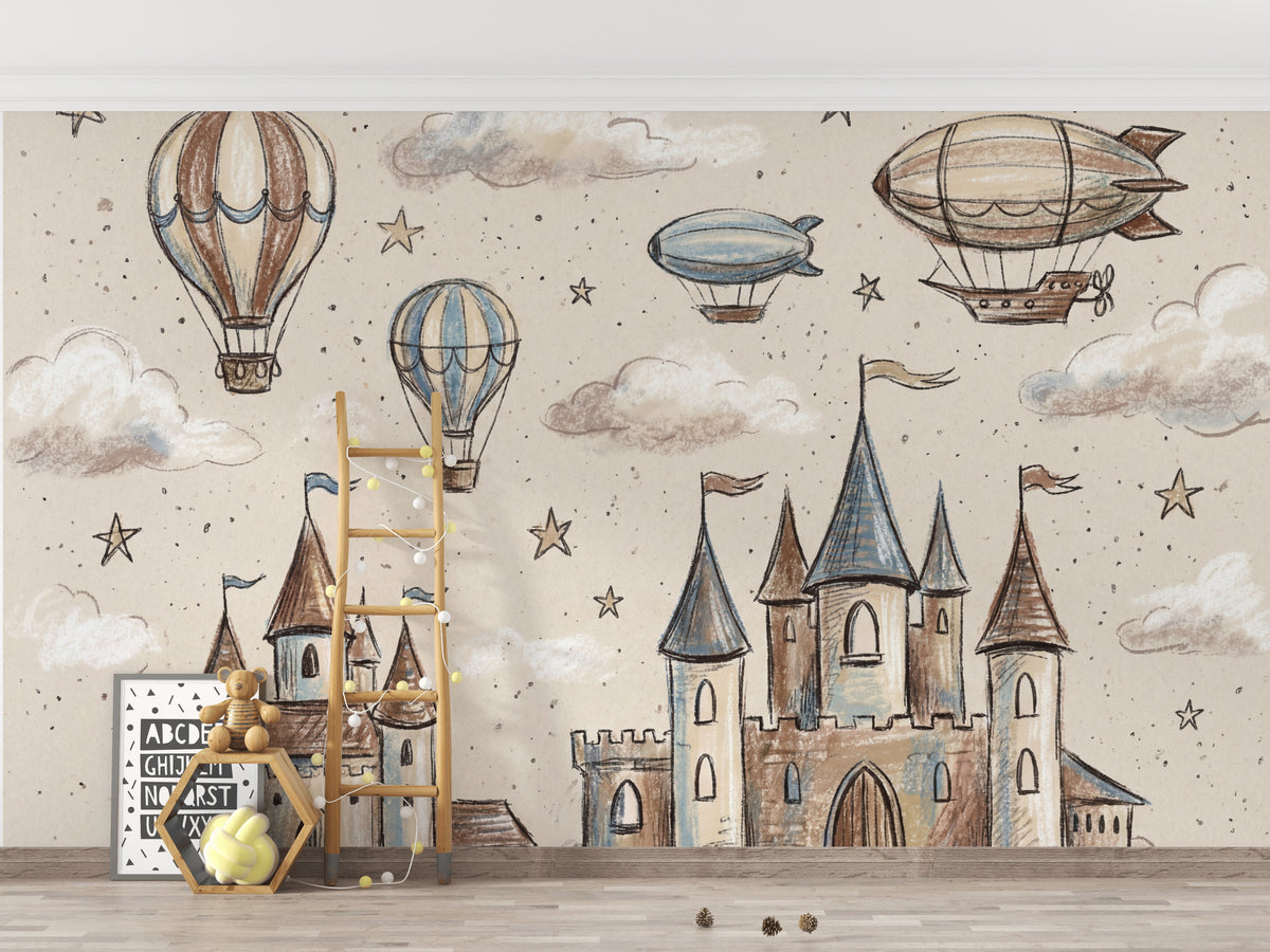 This enchanting design includes a whimsical castle surrounded by hot air balloons and a zeppelin, set against a backdrop of clouds and stars. The playful scene uses a color palette of blue, brown, and cream, perfect for a child's room.
