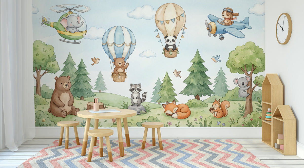 This playful wall mural shows a whimsical forest scene with animals, balloons, and aircraft. The cheerful design is vibrant with green, blue, and orange tones, perfect for a children's room.