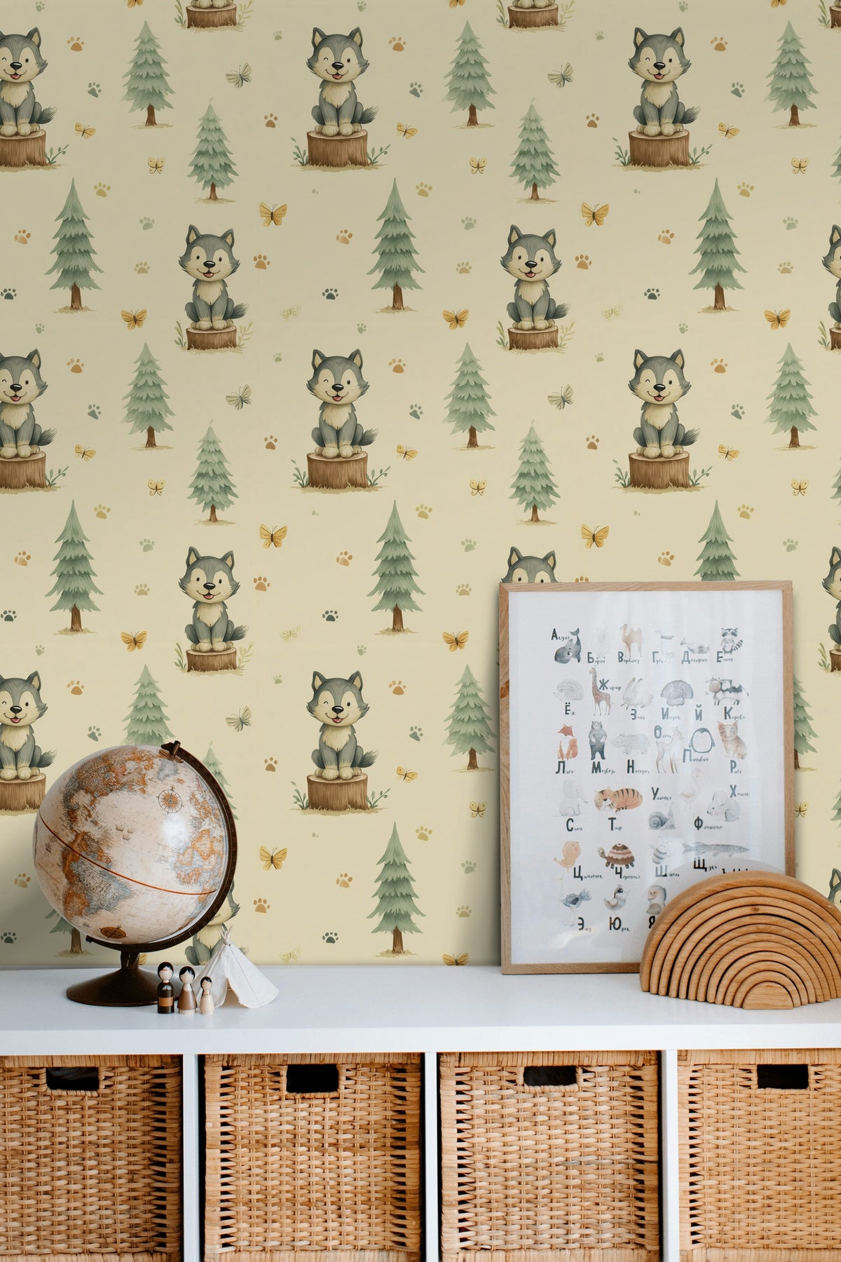This playful mural shows a puppy among trees with fluttering butterflies and paw prints. The beige, green, and gray tones provide a charming setting for a child's room.