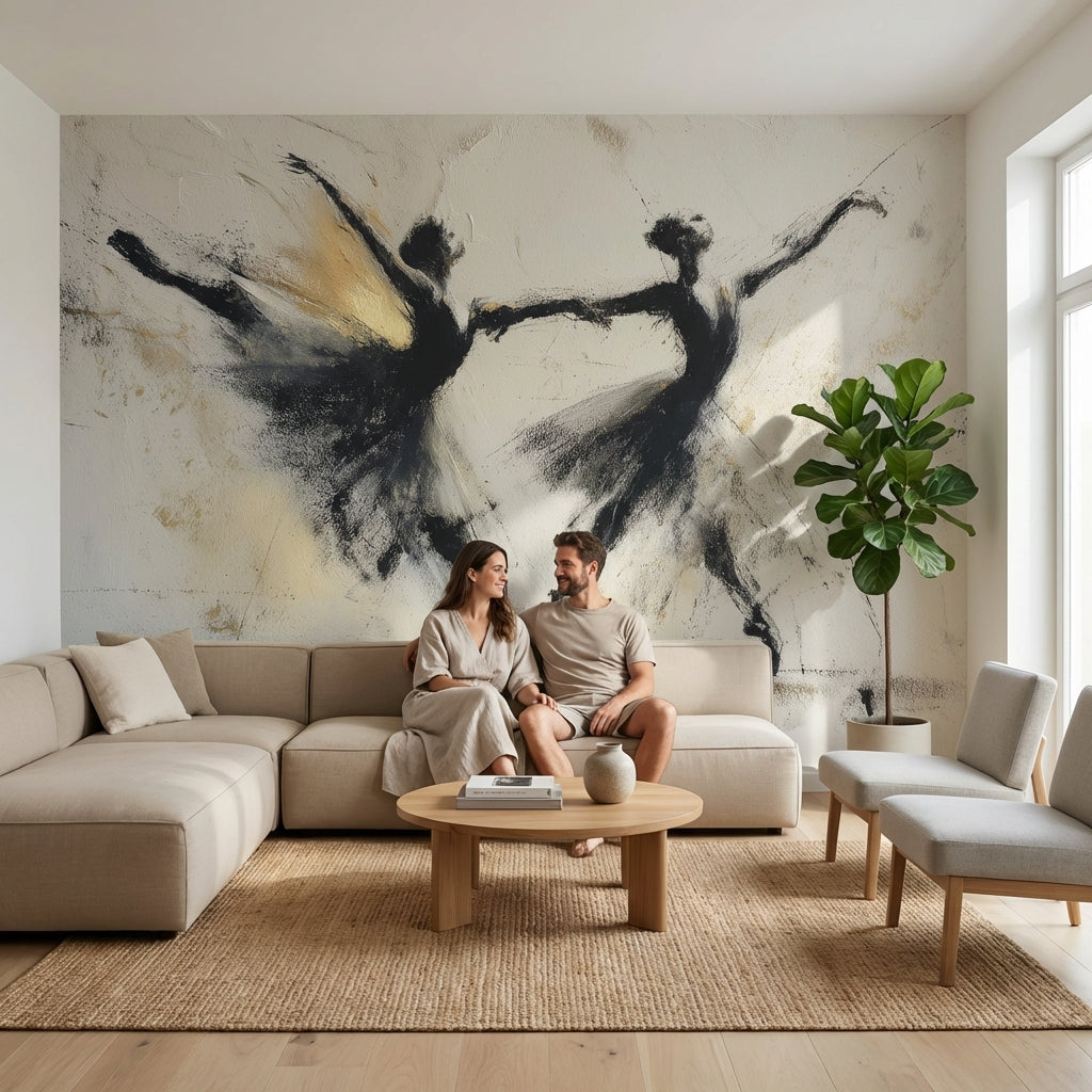 This abstract wallpaper features elegant ballerina figures and bold black and gold strokes against a white background. The design includes sophisticated elements in black, white, and gold tones.