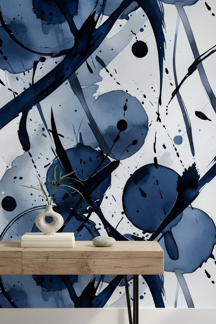 This abstract mural includes dynamic brushstrokes and circles in navy, white, and black. The energetic style on a white background adds a modern touch to any wall.