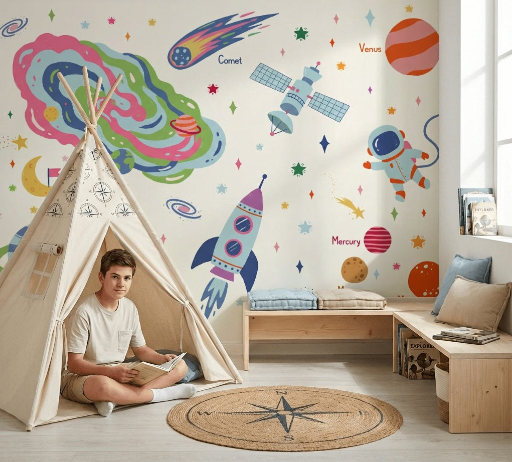 This space wallpaper has a white background and an astronaut floating near labeled planets, a nebula, and a comet. The design includes a rocket, a satellite style spacecraft, stars, and a small crescent moon flag detail in pink, mint, blue, navy, purple, orange, red, yellow, and green tones.