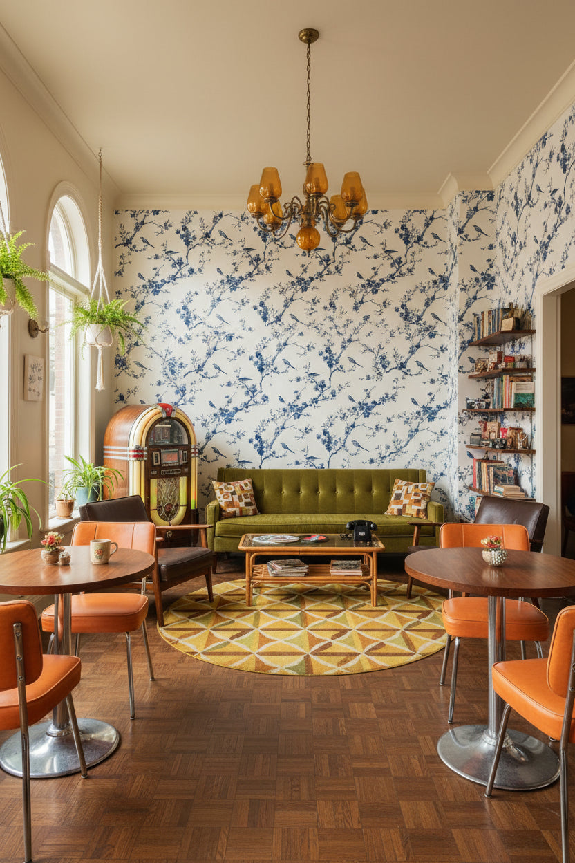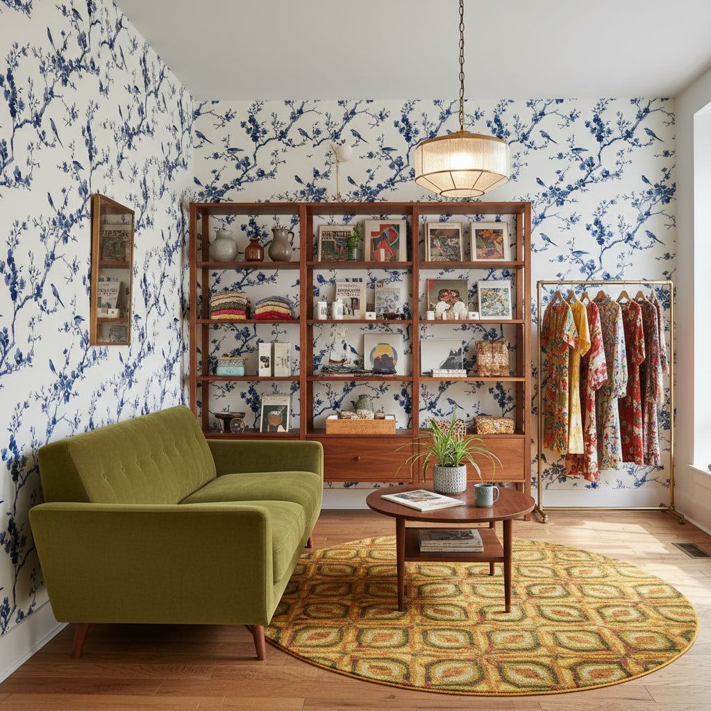 What type of furniture works well with the Blue Cherry Blossom and Bird Wallpaper?