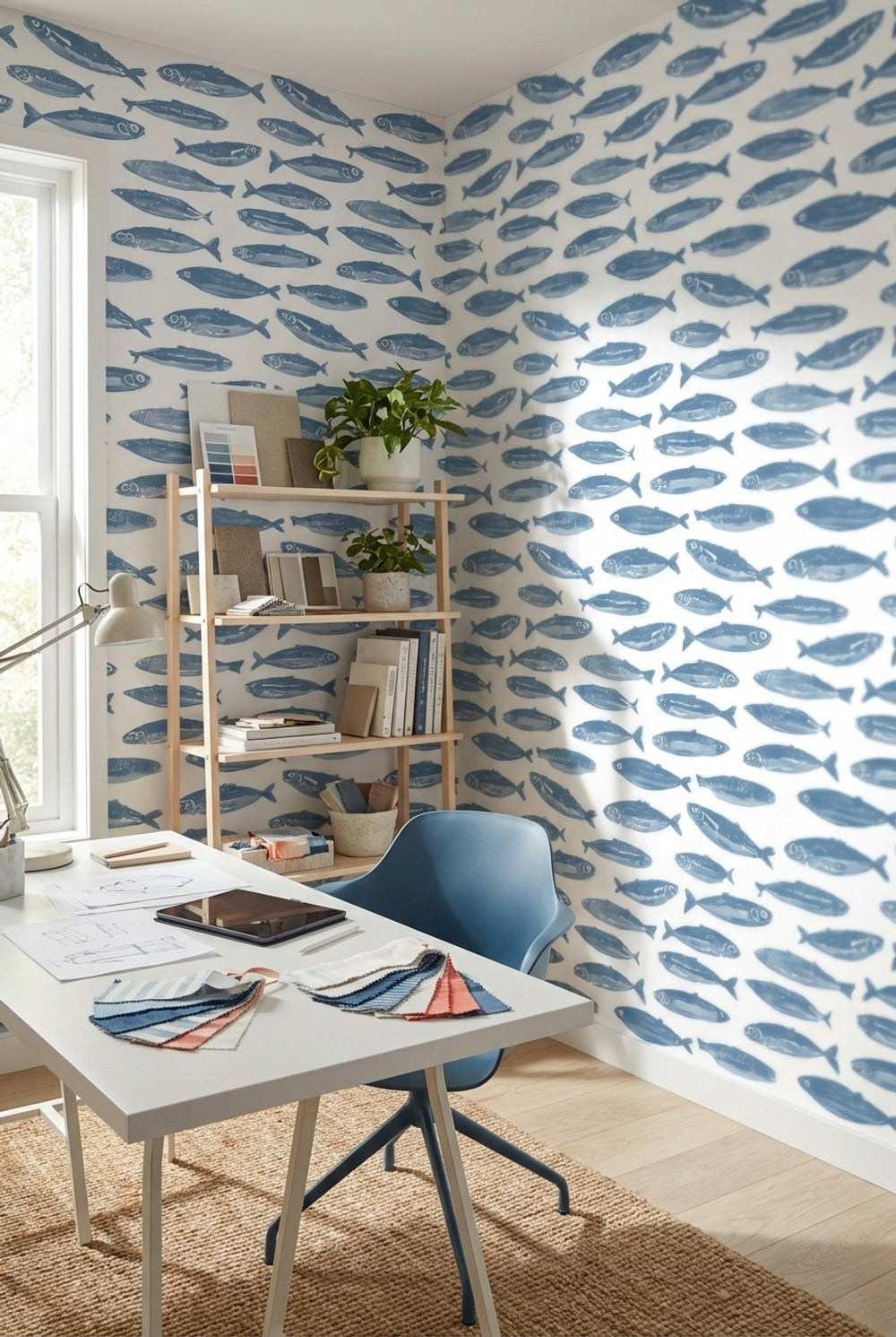 The Blue Nautical Fish Pattern Wallpaper stands out with its hand-painted art illusion and the way it captures light to enhance room ambiance. Its medium-scale pattern density offers a balanced aesthetic, making it a versatile choice for various room designs.