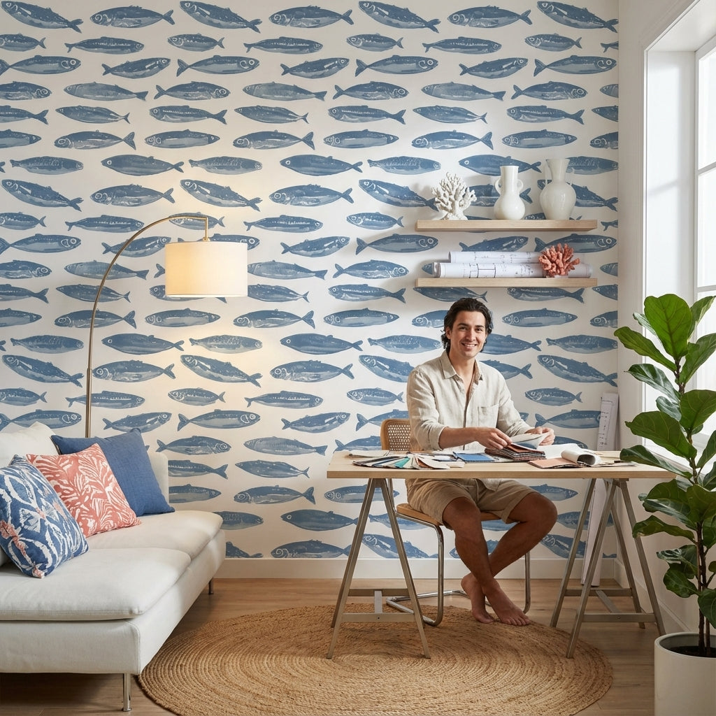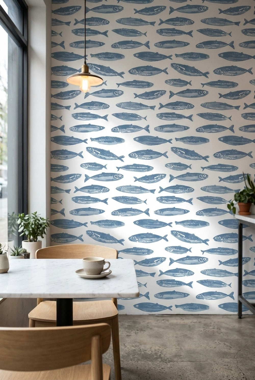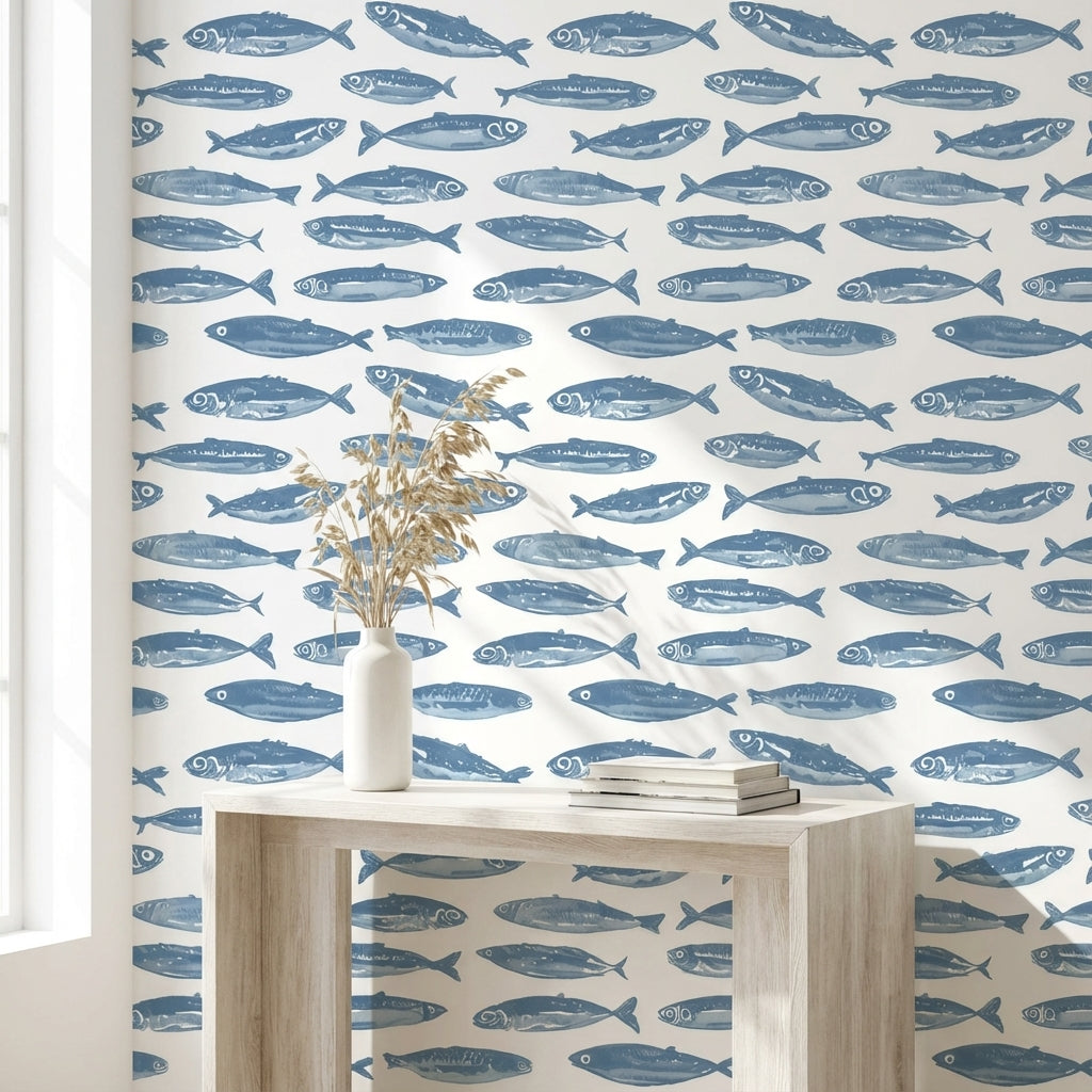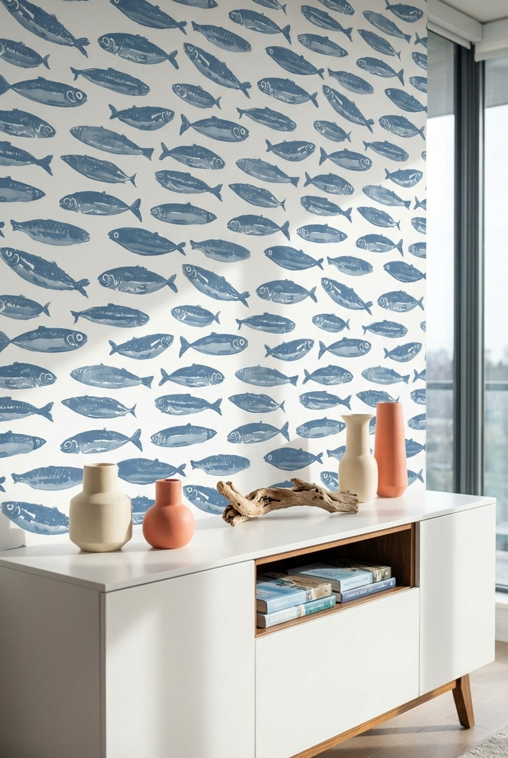 The watercolor-like texture and rhythmic arrangement of the blue fish motifs on the Blue Nautical Fish Pattern Wallpaper perfectly complement a coastal-themed room. Its design evokes a sense of movement and life, creating a breezy and relaxed atmosphere.