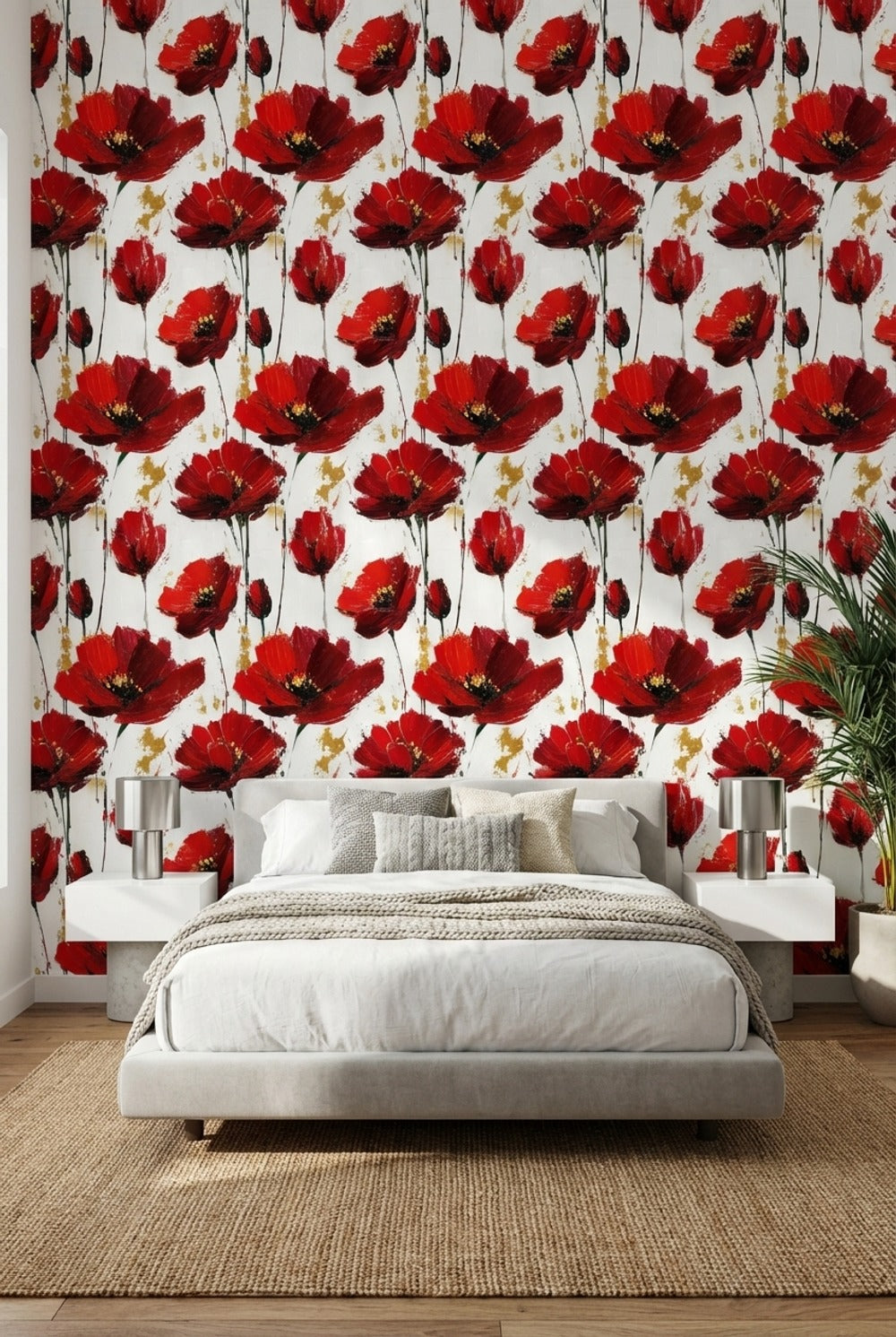 White Background Wallpaper Red Floral Decor - Complete Product Information