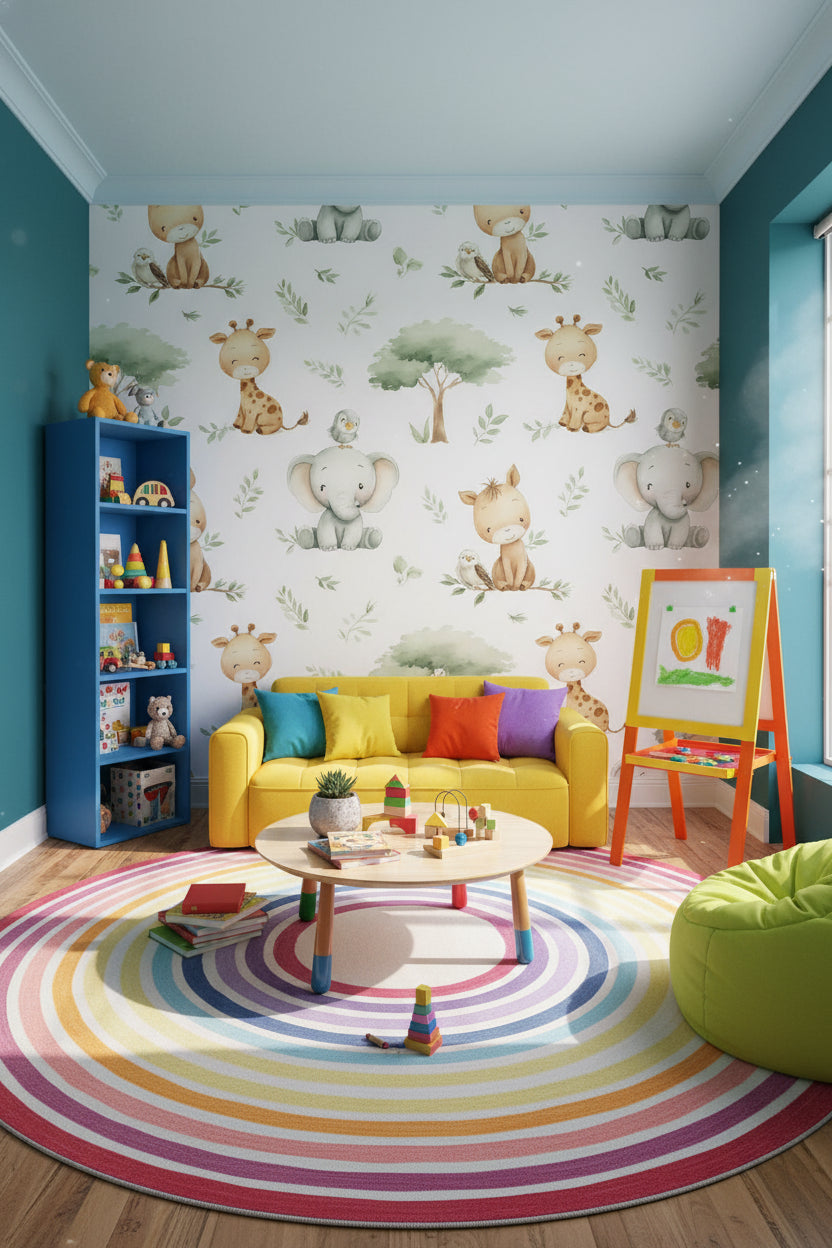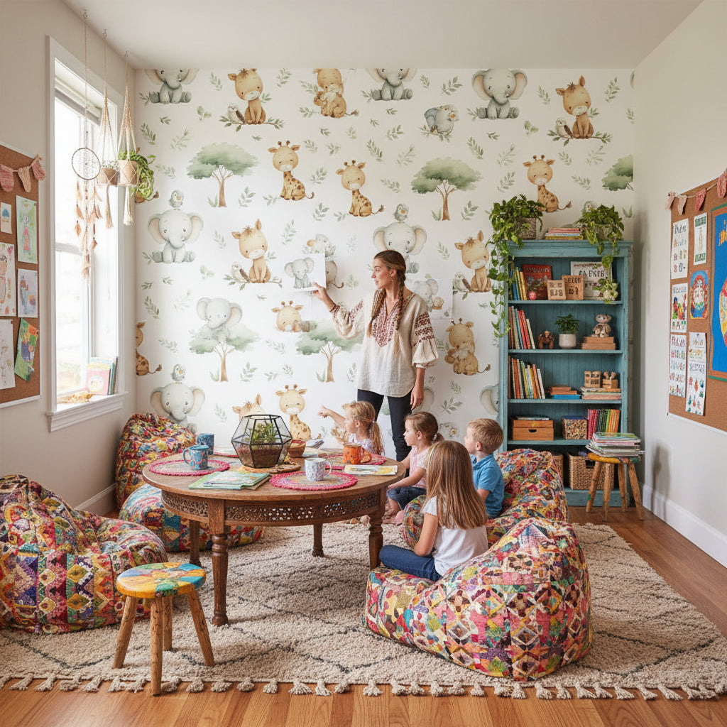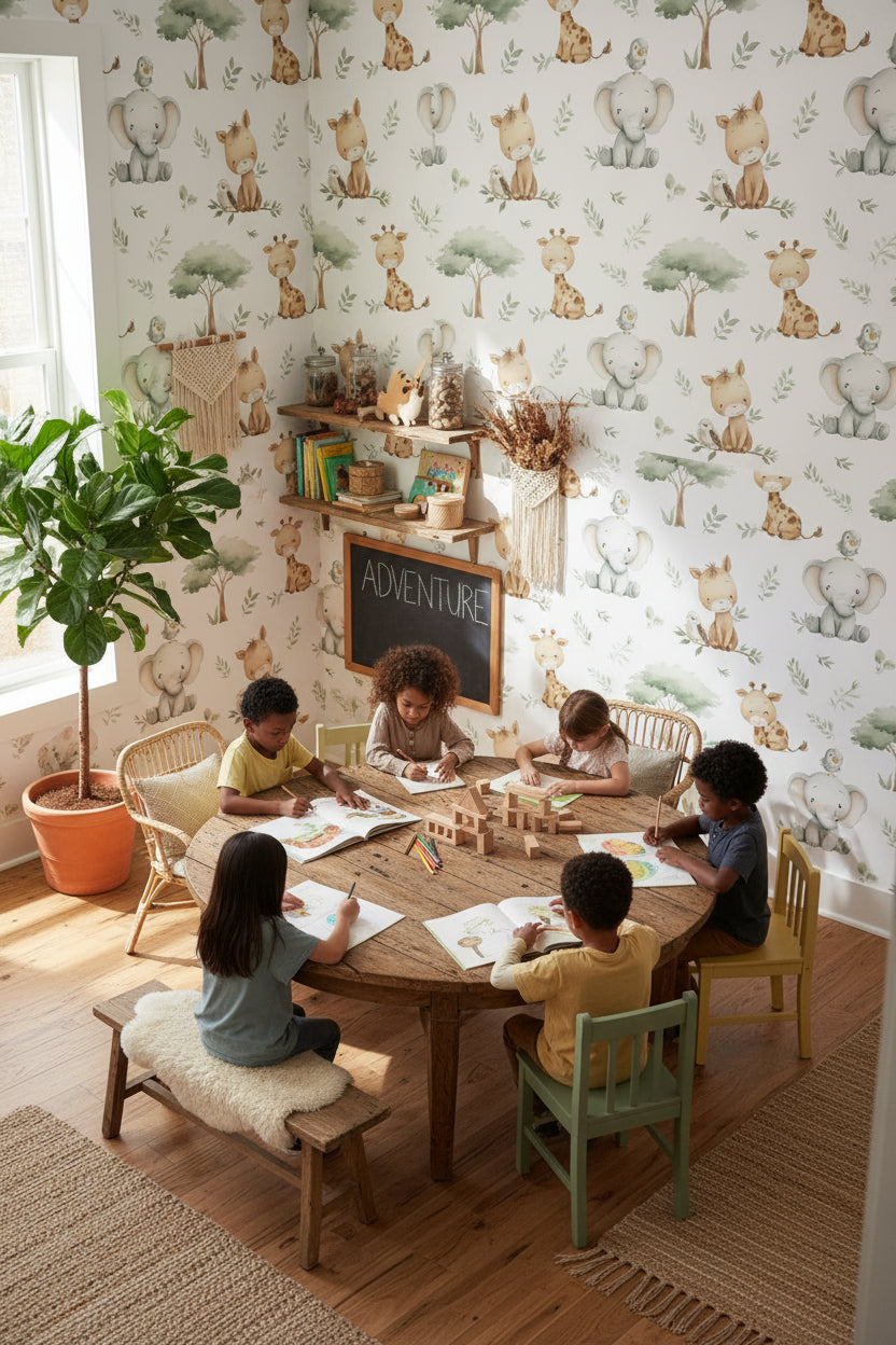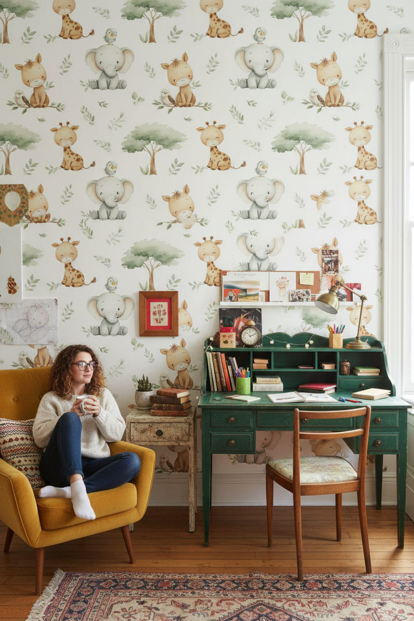 This mural shows a playful scene with animals like elephants and giraffes among trees and birds. The design includes a white background with shades of green, brown, and gray in a modern style.