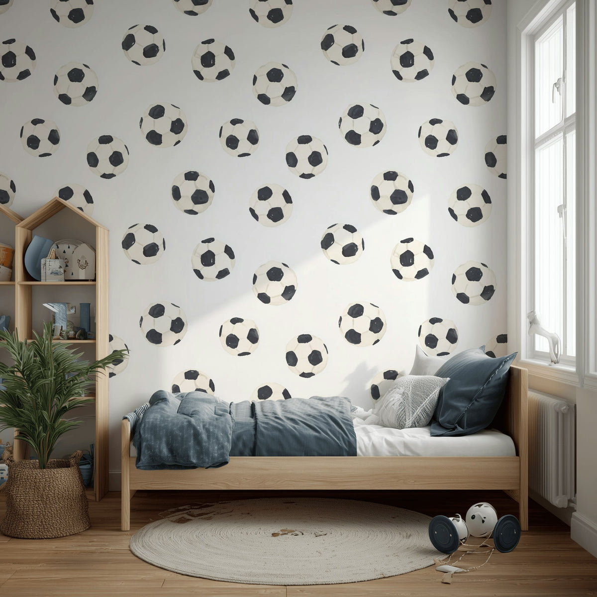 Energetic soccer balls in a playful black and white pattern dot the bright white background, creating a lively sports theme. The medium-sized motifs add a sense of movement and fun, perfect for kids' rooms and playrooms. This design reflects light beautifully, making even the smallest spaces feel more open and airy. Pairs well with modern children's furniture, activity tables, and colorful decor elements to enhance an active and vibrant environment.