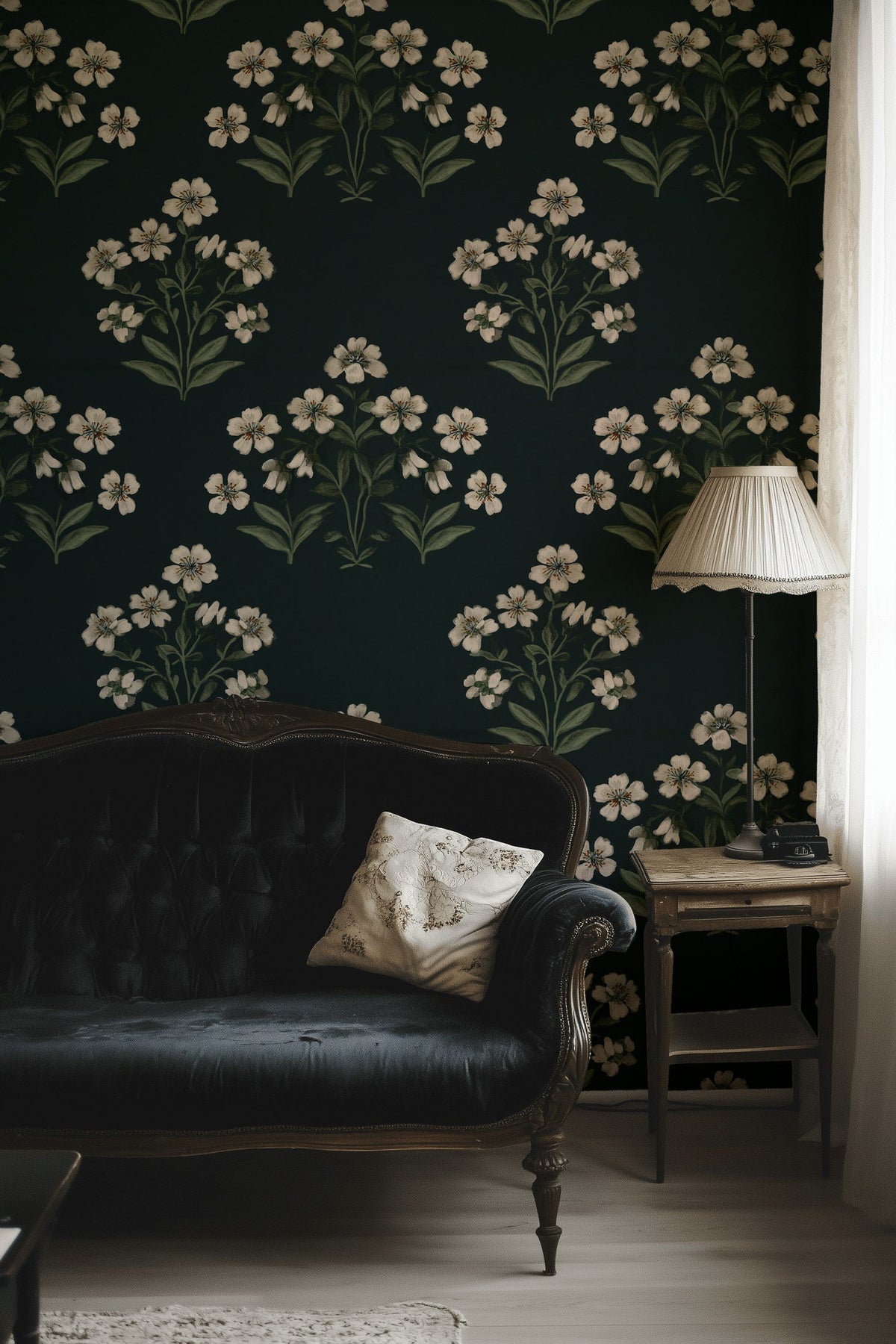 The pattern's deep background enhances room depth, creating an environment of both elegance and tranquility. Ideal under warm, ambient lighting.