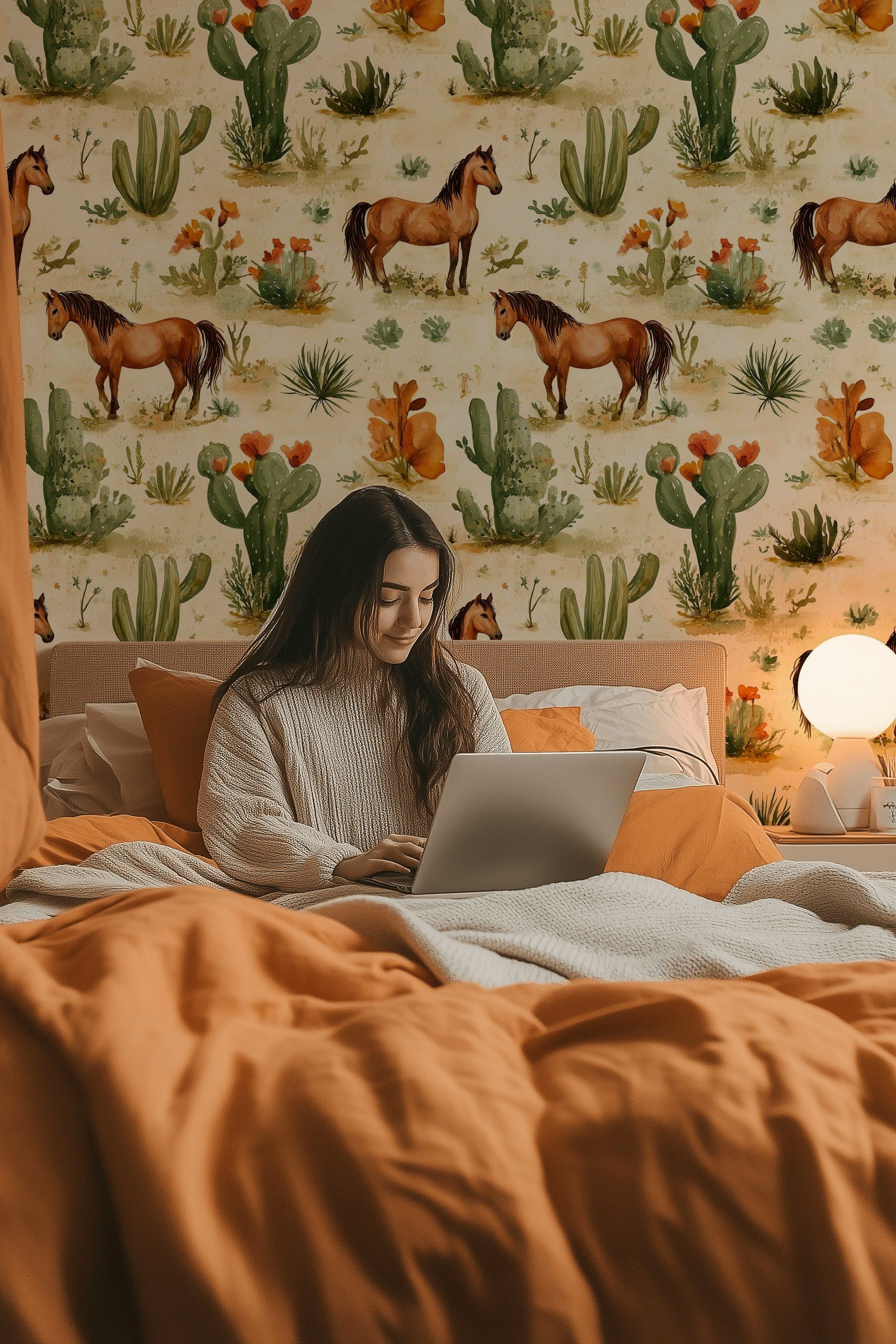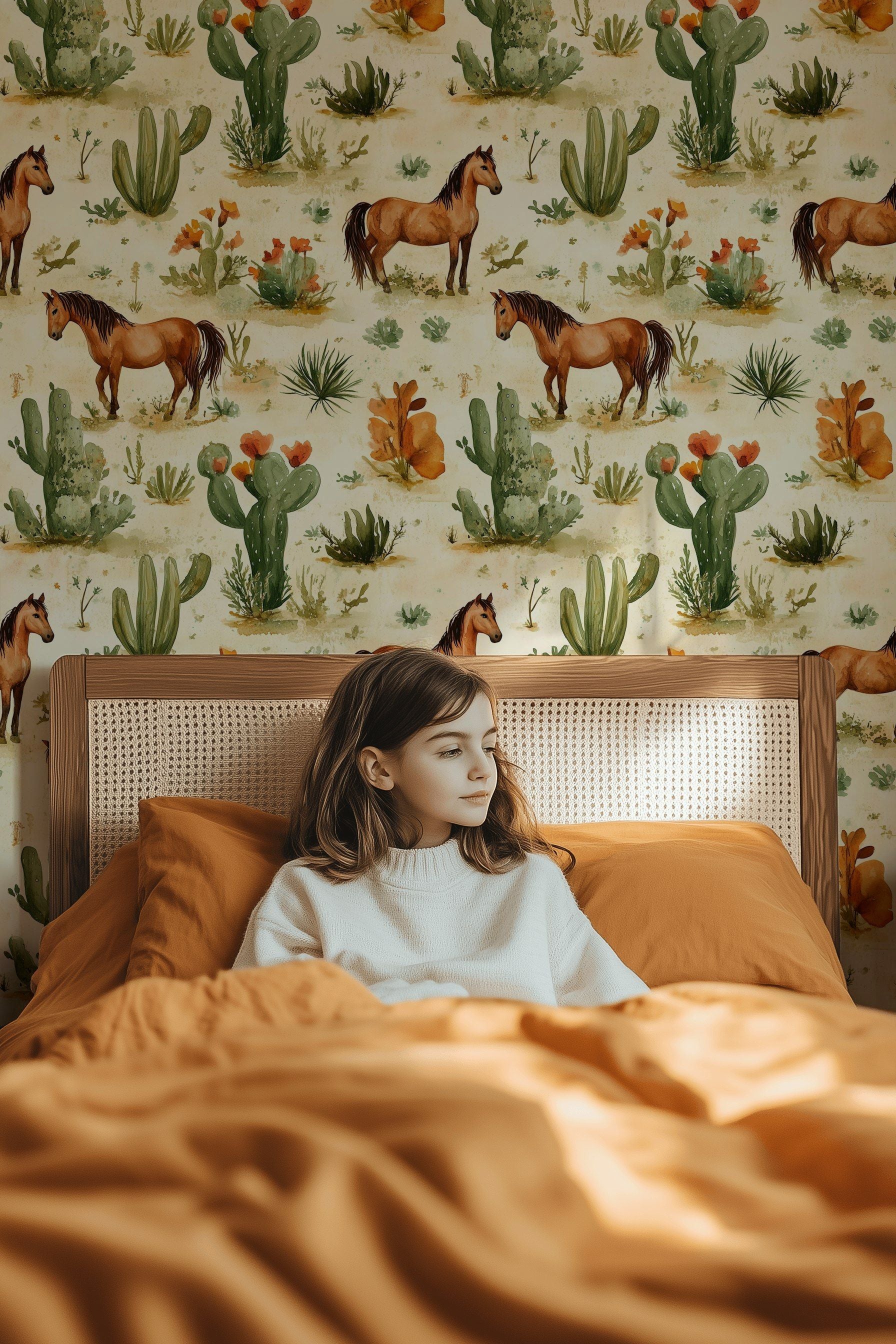 This Western-inspired mural features watercolor horses standing among desert cacti and sandy beige tones. Designed with hand-painted detail, it captures a warm Southwestern feel with its mix of soft greens, tans, and browns. Ideal for creating a rustic or boho western theme, the design blends desert plants, horse illustrations, and open landscape textures.