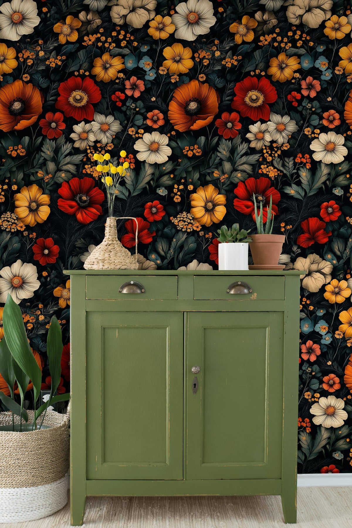 The rich red and yellow blooms of the Deep Black Background Bold Floral Wallpaper complement a bohemian style with their vibrant colors and intricate details. Pair it with eclectic furnishings and textured fabrics to enhance the bohemian vibe in your space.