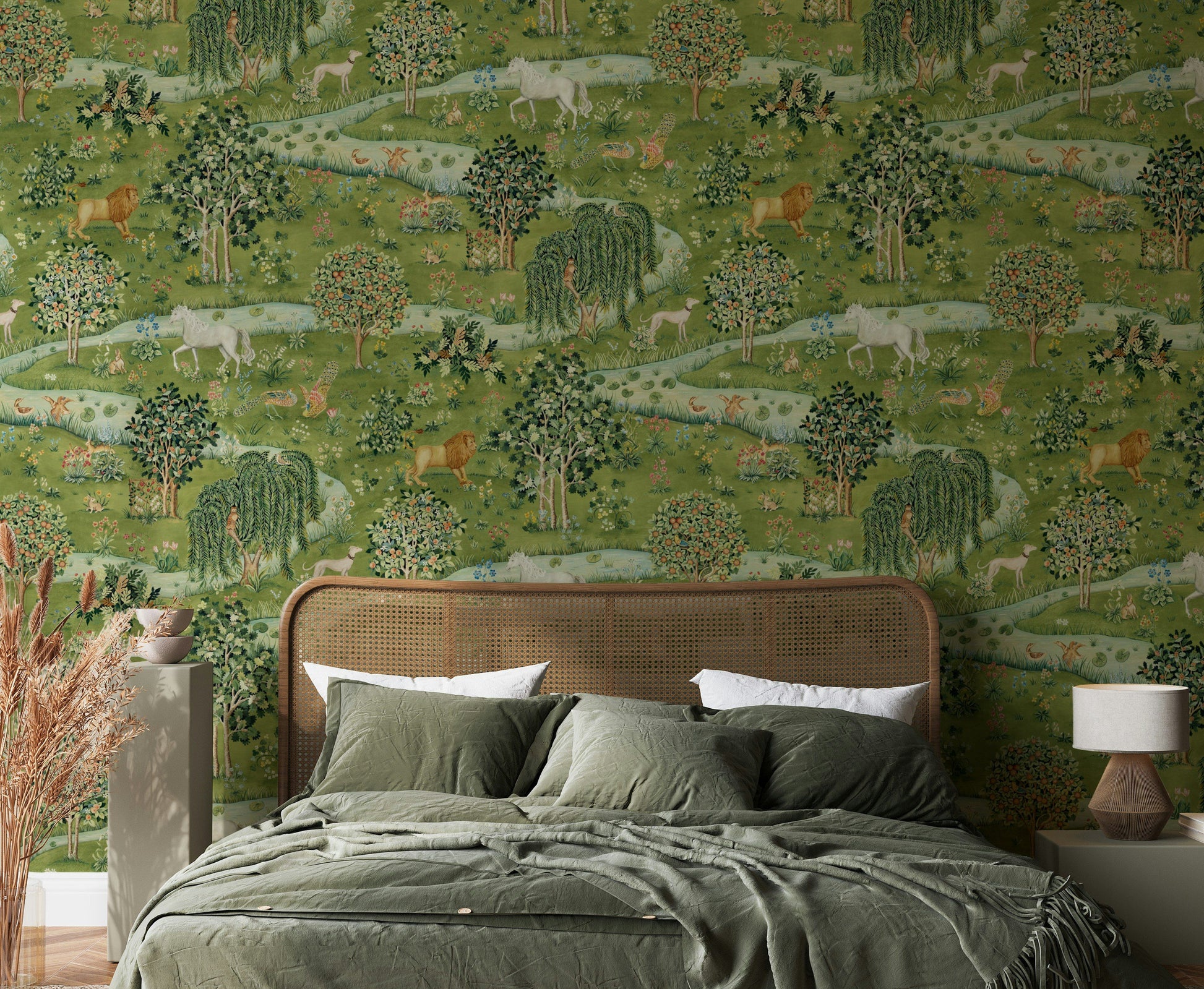 This wallpaper features a lush green woodland scene with rivers, flowering trees, and roaming animals including lions, unicorns, deer, and birds. The detailed design gives a storybook atmosphere, with layered foliage and soft painterly textures. woodland mural, forest wallpaper, unicorn wall mural, animal wallpaper, fantasy mural, storybook decor, lion wallpaper, garden wall mural, whimsical wallpaper, green forest mural, enchanted wall decor, wildlife wallpaper, river scene mural